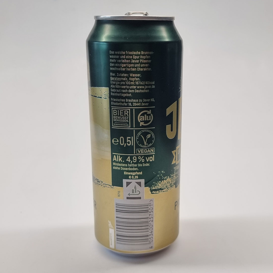 Das weiche friesische Brunnenwasser und eine Spur Hopfen mehr verleihen Jever Pilsener den einzigartigen und unverwechselbar herben Charakter. / Bier. Zutaten: Wasser, Gerstenmalz, Hopfen. / Energie pro 100ml: 167 kJ / 40 kcal / Alle Nährwerte unter www.jever.de / Gebraut nach dem Deutschen Reinheitsgebot. / Friesisches Brauhaus zu Jever KG, Elisabethufer 18, 26441 Jever / BIER BEWUSST GENIESSEN. DIE DEUTSCHEN BRAUER. / alu / e 0,5l / V-LABEL-INTERNATIONAL V-LABEL.COM / Alk. 4,9 % vol / Mindestens haltbar bis Ende: siehe Dosenboden. / Einwegpfand € 0,25 / 15715 / 4 053400 257501