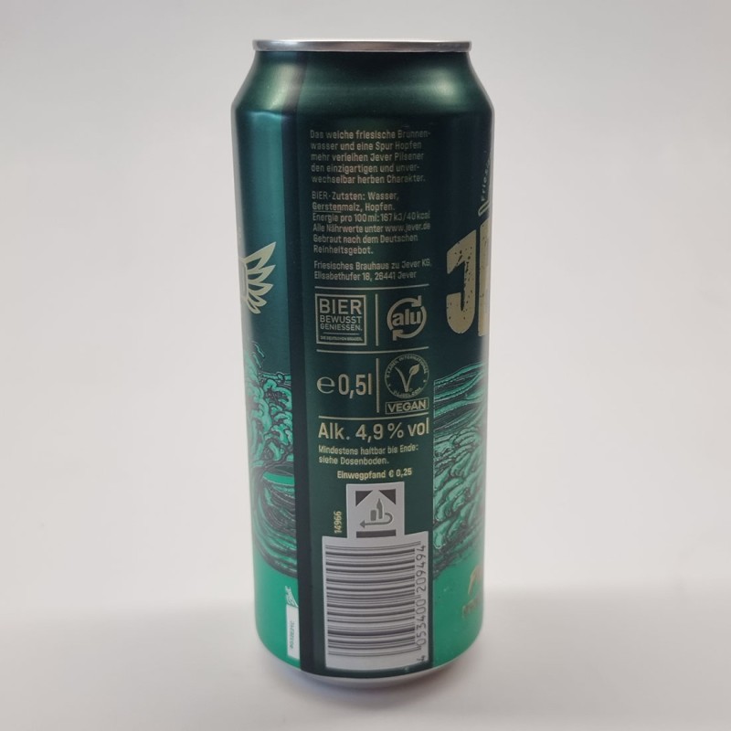 Das weiche friesische Brunnenwasser und eine Spur Hopfen mehr verleihen Jever Pilsener den einzigartigen und unverwechselbar herben Charakter. / Bier. Zutaten: Wasser, Gerstenmalz, Hopfen. / Energie pro 100ml: 167 kJ / 40 kcal / Alle Nährwerte unter www.jever.de / Gebraut nach dem Deutschen Reinheitsgebot. / Friesisches Brauhaus zu Jever KG, Elisabethufer 18, 26441 Jever / BIER BEWUSST GENIESSEN. DIE DEUTSCHEN BRAUER. / alu / e 0,5l / V-LABEL INTERNATIONAL V-LABEL.COM / Alk. 4,9 % vol / Mindestens haltbar bis Ende: siehe Dosenboden. / Einwegpfand € 0,25 / 14966 / 4 053400 209494