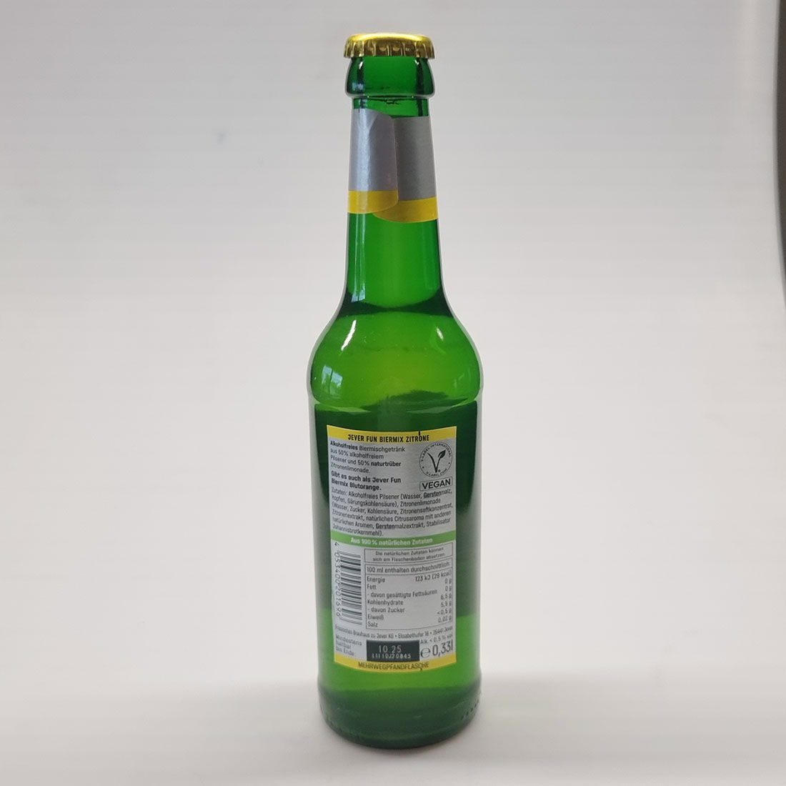 JEVER FUN BIERMIX ZITRONE / Alkoholfreies Biermischgeränk aus 50% alkoholfreiem Pilsener und 50% naturtrüber Zitronenlimonade. / Gibt es auch als Jever Fun Biermix Blutorange. / Zutaten: Alkoholfreies Pilsener (Wasser, Gerstenmalz, Hopfen, Gärungskohlensäure), Zitronenlimonade (Wasser, Zucker, Kohlensäure, Zitronensaftkonzentrat, Zitronenextrakt, natürliches Citrusaroma mit anderen natürlichen Aromen, Gerstenmalzextrakt, Stabilisator Johannisbrotkernmehl). / Aus 100% natürlichen Zutaten / Die natürlichen Zutaten können sich am Flaschenboden absetzen. / 4 053400 201696 / 100 ml enthalten durchschnittlich: / Energie 123 kJ (29kcal) / Fett 0 g / - davon gesättigte Fettsäuren 0 g / Kohlenhydrate 6,5 g / - davon Zucker 5,5 g / Eiweiß < 0,5 g / Salz 0,02 g / Friesisches Brauhaus zu Jever KG Elisabethufer 18 26441 Jever / Mindestens haltbar bis Ende 10.25 L1110J20845 / Alk. < 0,5 % vol / e 0,33l / MEHRWEGPFANDFLASCHE