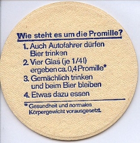 Wie steht es um die Promille? / 1. Auch Autofahrer dürfen Bier trinken / 2. Vier Glas (je 1/4l) ergeben ca. 0,4 Promille* / 3. Gemächlich trinken und beim Bier bleiben / 4. Etwas dazu essen / * Gesundheit und normales Körpergewicht vorausgesetzt.