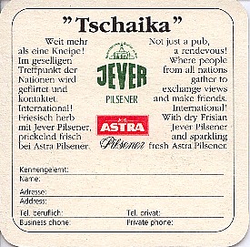 “Tschaika” / Weit mehr als eine Kneipe! Im geselligen Treffpunkt der Nationen wird geflirtet und kontaktet. International! Friesisch herb mit Jever Pilsener, prickelnd frisch mit Astra Pilsener. / Aus dem friesischen Brauhaus zu Jever / JEVER PILSENER / ASTRA Pilsener / Not just a pub, a rendevous! Where people from all nations gather to exchange views and make friends. International! With dry Frisian Jever Pilsener and sparkling fresh Astra Pilsener. / Kennengelernt: / Name: / Adresse: / Address: / Tel. beruflich: / Business phone: / Tel. privat: / Private phone: