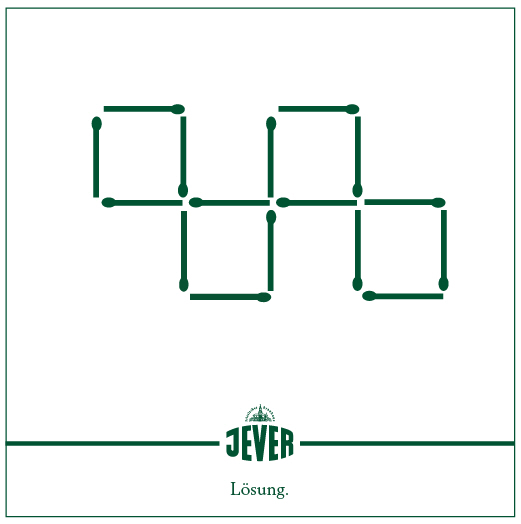 Friesisches Brauhaus / JEVER / Lege zwei Streichhölzer um, so dass du vier Quadrate aus 16 Streichhölzern erhältst. / Lösung unter www.jever.de