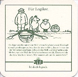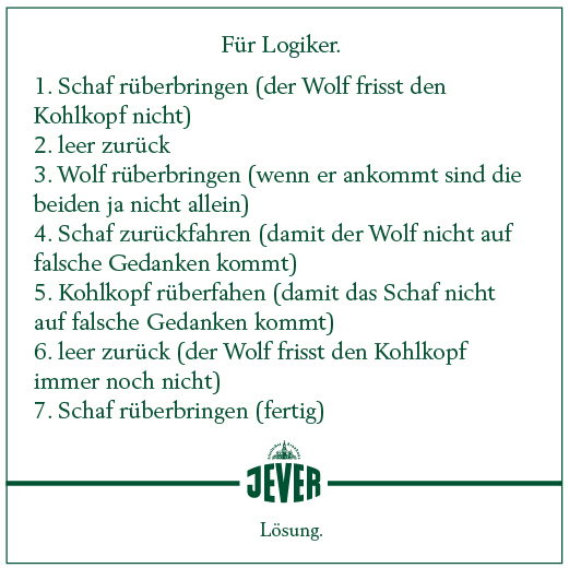 Für Logiker. / Ein Bauer möchte mit einem Wolf, einem Schaf und einem Kohlkopf einen Fluss überqueren. Sen Boot ist aber so klein, dass er immer nur einen Teil mitnehmen kann. Dabei dürfen Wolf und Schaf nicht allein bleiben, weil der Wolf das Schaf sonst fressen würde. Ebenso würde das Schaf den Kohl fressen. Wie kommen alle auf die andere Seite? / Friesisches Brauhaus / JEVER / Ist doch logisch.