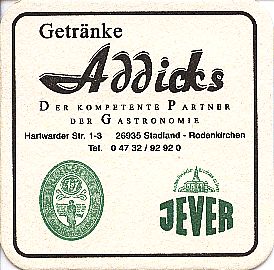 Getränke Addicks / DER KOMPETENTE PARTNER DER GASTRONOMIE / Hartwarder Str. 1-3 26935 Stadland-Rodenkirchen / Tel.04732/92920 / Aus dem Friesischen Brauhaus zu Jever / JEVER