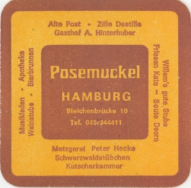 Posemuckel / HAMBURG Bleichenbrücke 10 Tel. 040/344411 / Alte Post - Zille Destille / Gasthof A. Hinterhuber / Willem’s gute Stube / Friesen Kate - Seute Deern / Musikladen - Apotheke / Weinstube - Bierbrunnen / Metzgerei Peter Hacke / Schwarzwaldstübchen / Kutscherkammer