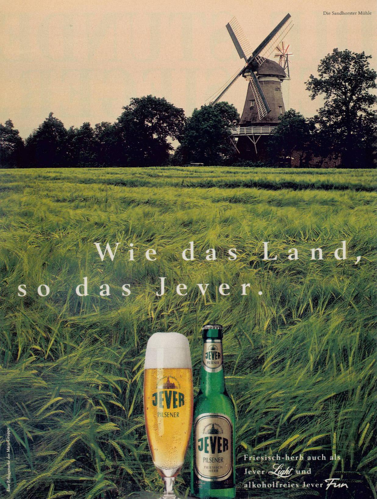 Die Sandhorster Mühle / Wie das Land, so das Jever. / Aus dem Friesischen Bruahaus zu Jever / JEVER / PILSENER / Aus dem Friesischen Brauhaus zu Jever / JEVER / PILSENER / Aus dem Friesischen Brauhaus zu Jever / JEVER / PILSENER / FRIESISCH HERB / alc 4,9% vol e 0,33l / Mindestens haltbar bis Ende … PFANDFLASCHE / Friesisch-herb auch als Jever Light und alkoholfreies Jever Fun