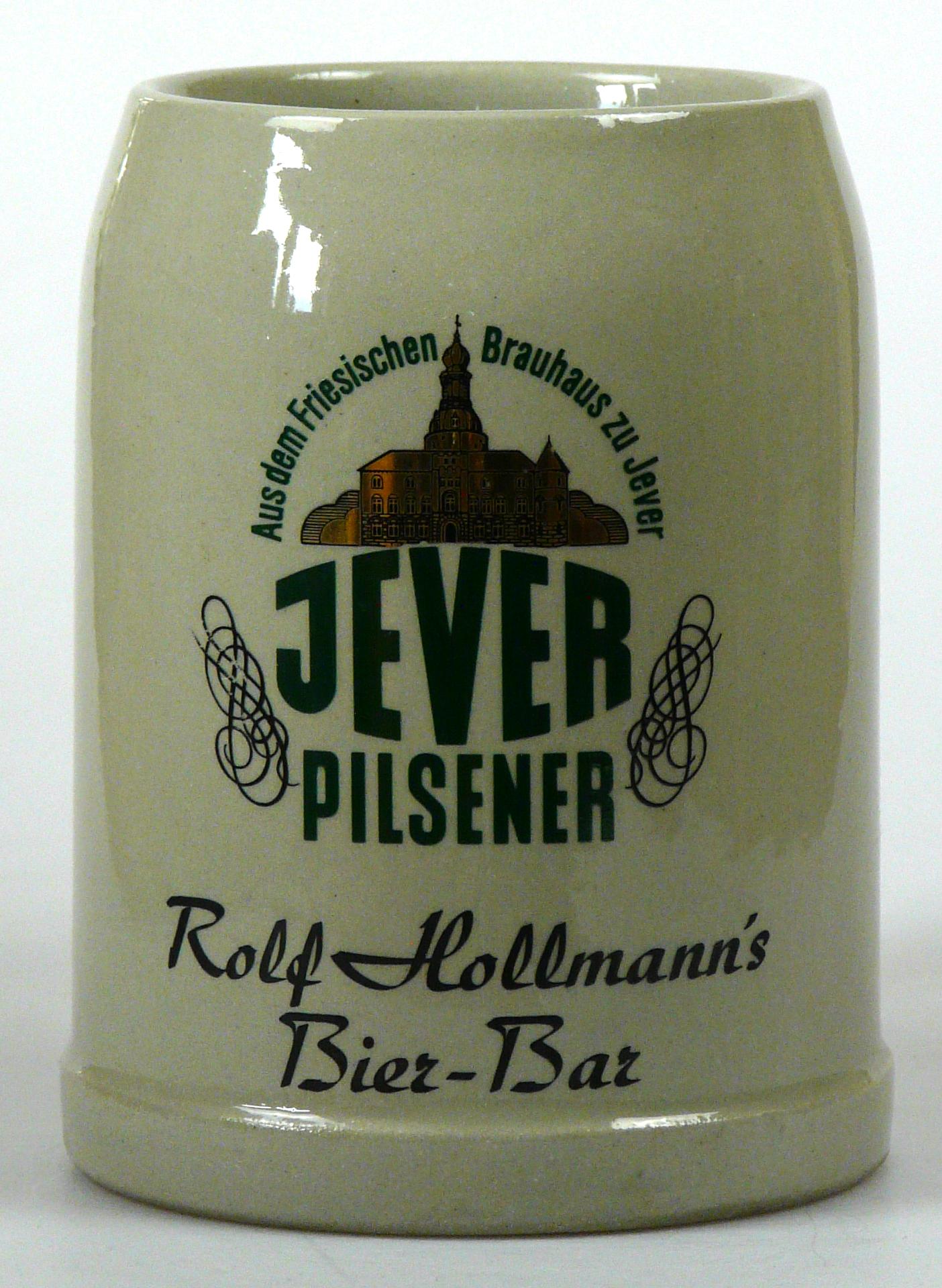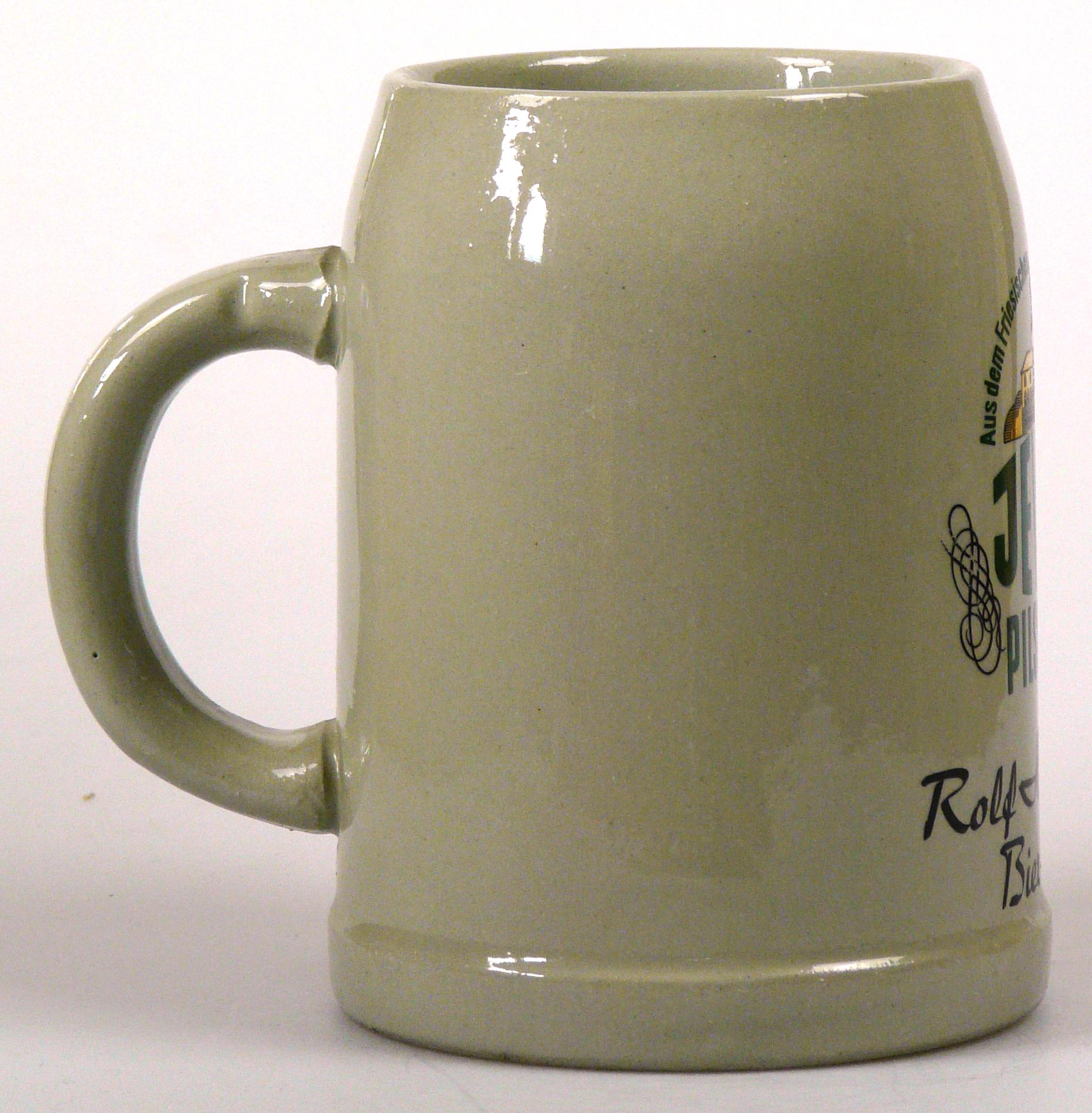 Attribut Wert Alter (min.) Alter (max.) Identifikation (Jever-Fan) ID I002013 / K0119 / B4 Typ Krug Attribute (Allgemein) Form Krug / Seidel Füllstrich geprägt > 0,5l//// Hersteller-Zeichen WW Inhalt (l) 0,50 Logo Pilsener 6 Maße HxBxT (cm) 12,8x9,9x9,9 Material Steingut Sorte Pilsener