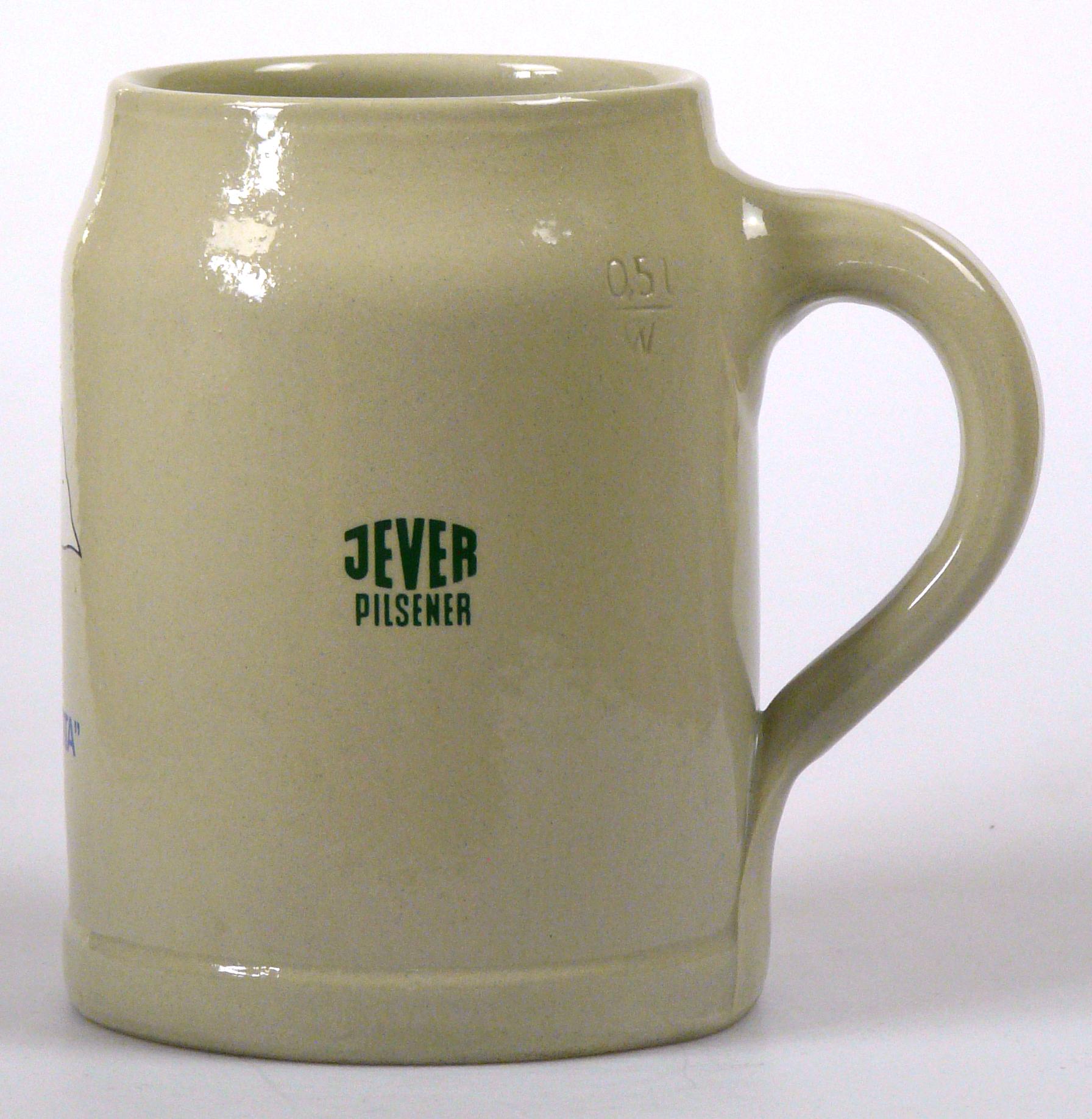 Attribut Wert Alter (min.) Alter (max.) Identifikation (Jever-Fan) ID I002014 / K0120 / B4 Typ Krug Attribute (Allgemein) Form Krug / Seidel Füllstrich geprägt > 0,5l////W Hersteller-Zeichen W Inhalt (l) 0,50 Logo Pilsener 2 Maße HxBxT (cm) 13x9,9x9,9 Material Steingut Sorte Pilsener