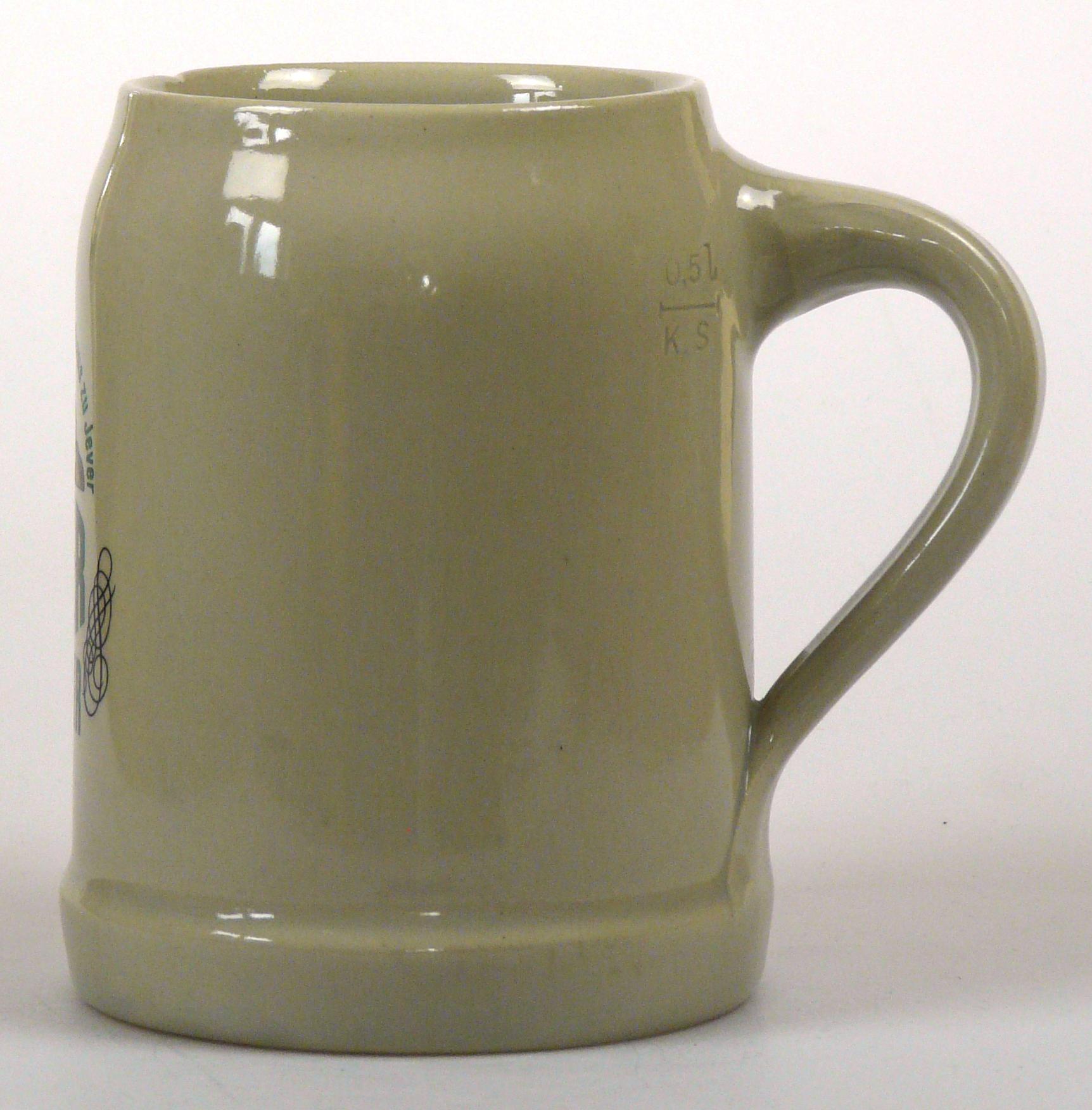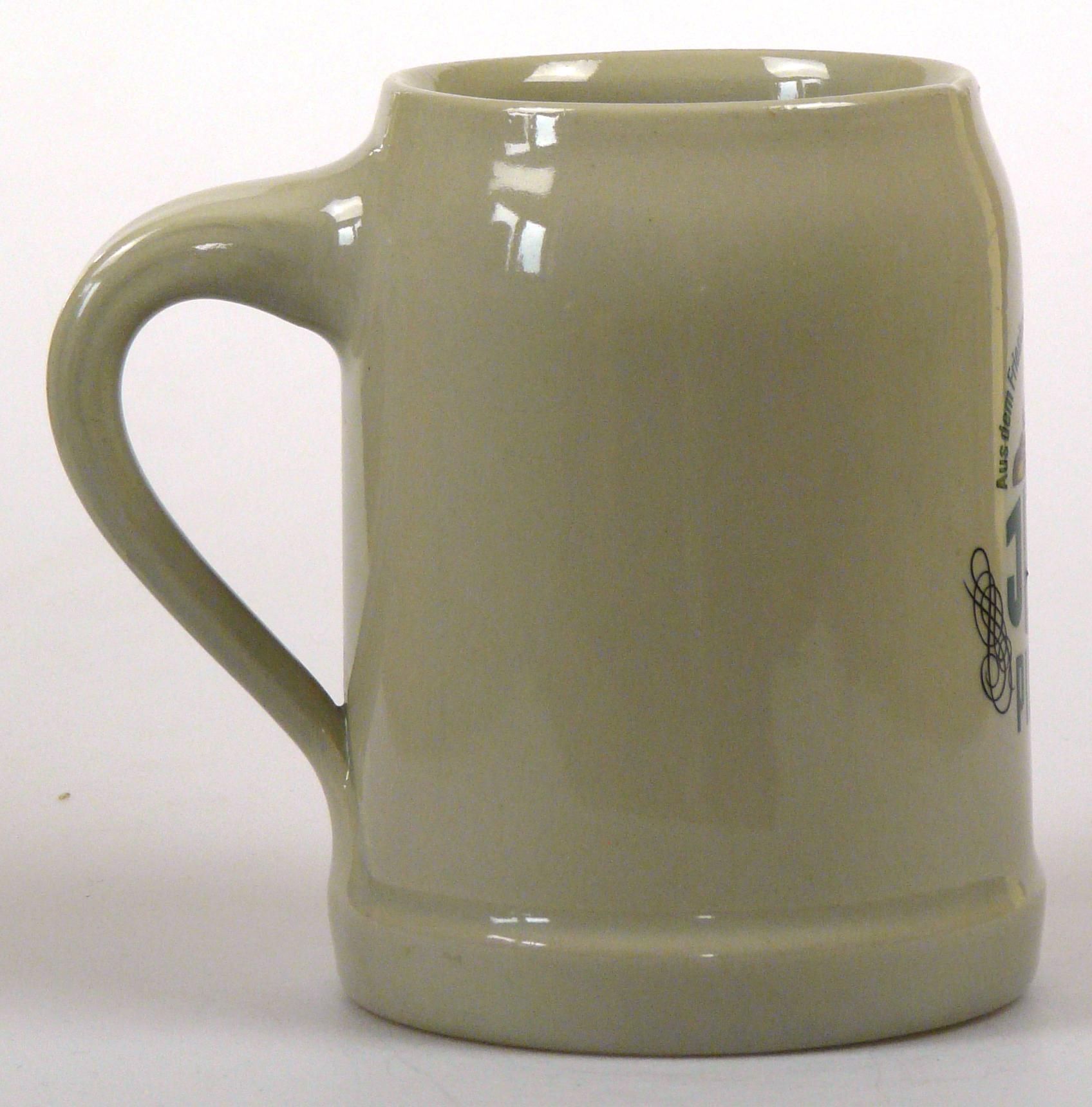 Attribut Wert Alter (min.) Alter (max.) Identifikation (Jever-Fan) ID I002061 / K0167 / B7 Typ Krug Attribute (Allgemein) Form Krug / Seidel Füllstrich geprägt > 0,5l////KS Herstellername Bierkrugfabrik Klaus Ströder GmbH & Co. KG Hersteller-Zeichen KS Inhalt (l) 0,50 Logo Pilsener 6 Maße HxBxT (cm) 12,6x9,8x9,8 Material Steingut Sorte Pilsener