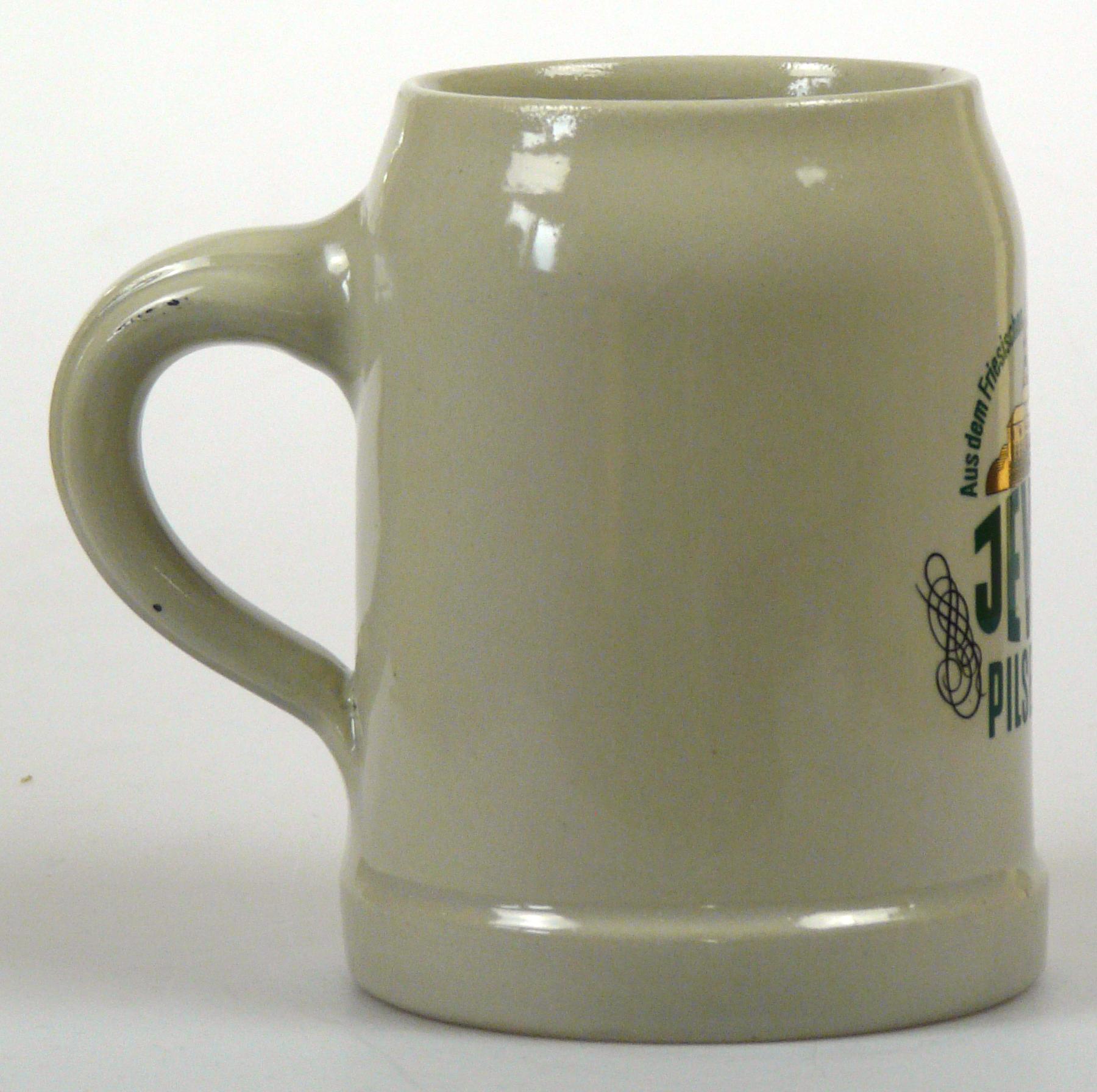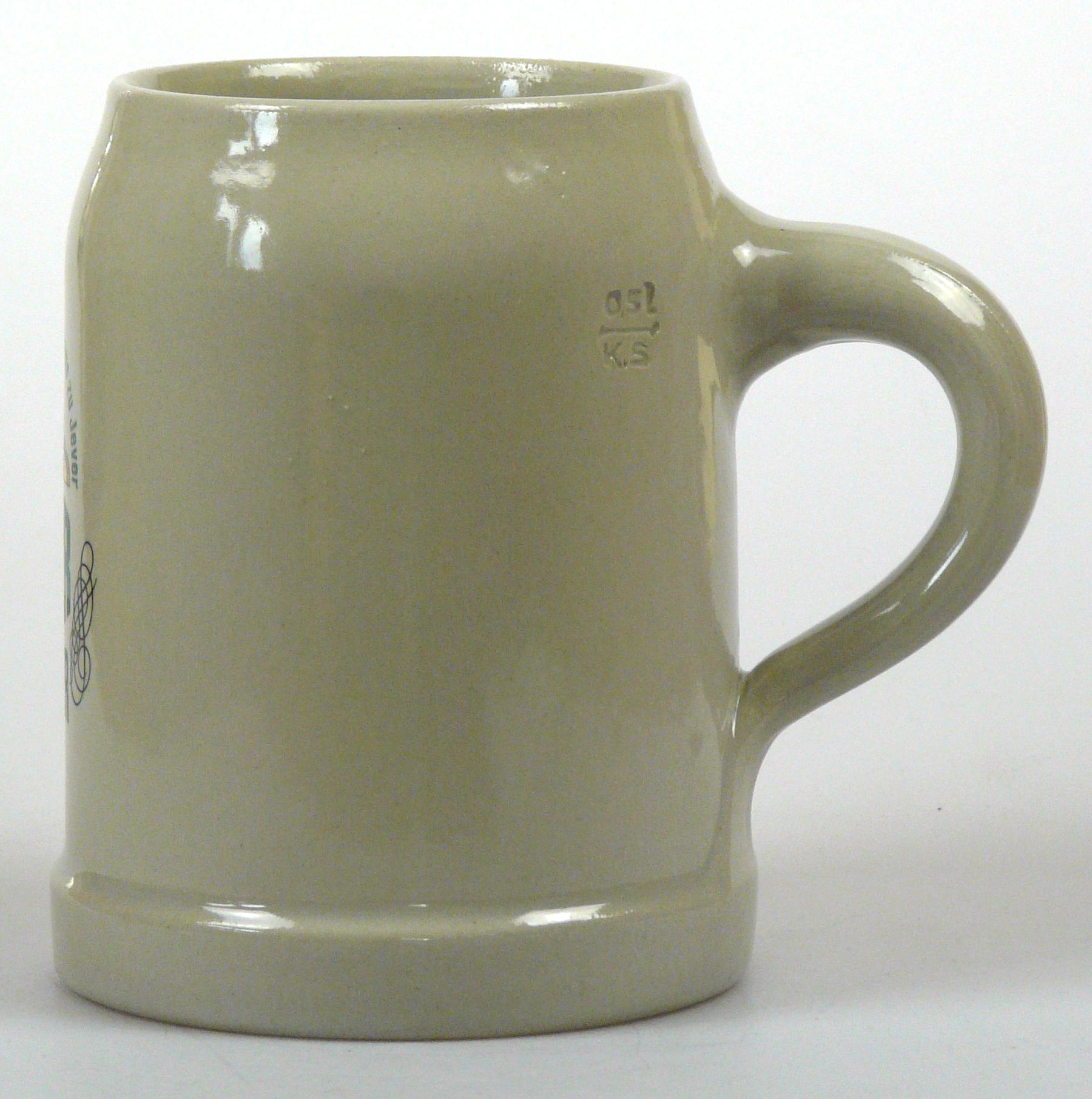Attribut Wert Alter (min.) Alter (max.) Identifikation (Jever-Fan) ID I002071 / K0168 / B7 Typ Krug Attribute (Allgemein) Form Krug / Seidel Füllstrich geprägt > 0,5l////KS Herstellername Bierkrugfabrik Klaus Ströder GmbH & Co. KG Hersteller-Zeichen KS Inhalt (l) 0,50 Logo Pilsener 6 Maße HxBxT (cm) 12,6x10x10 Material Steingut Sorte Pilsener