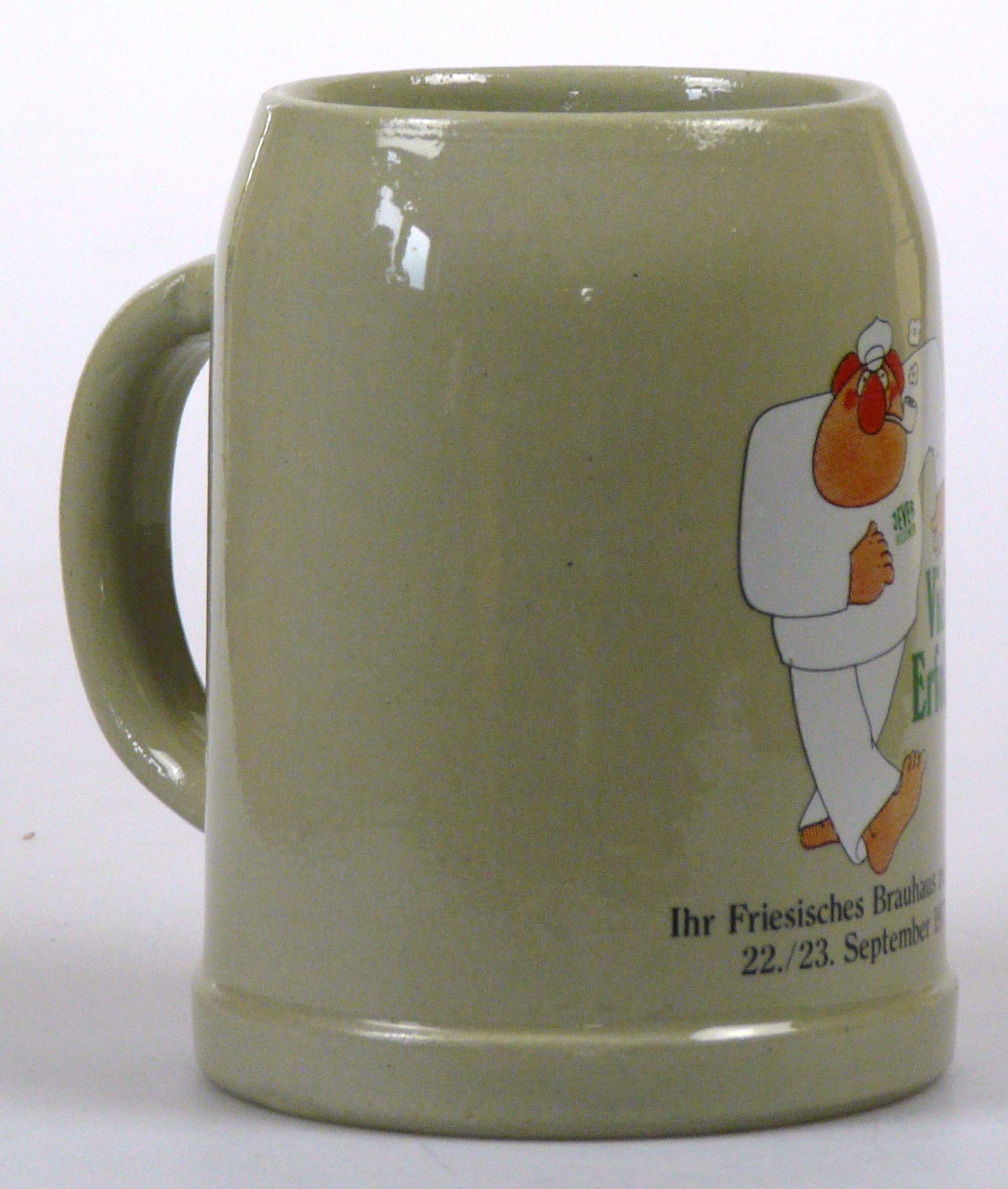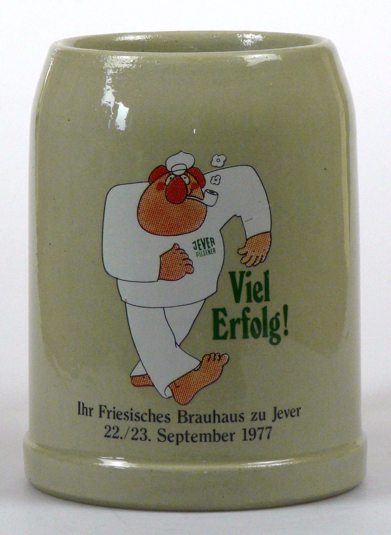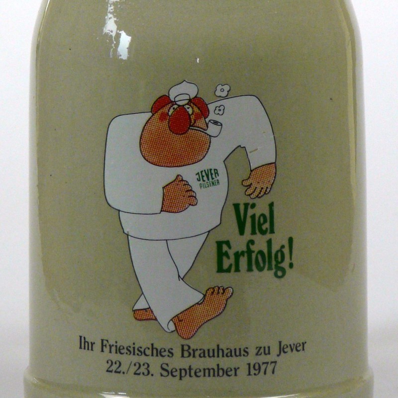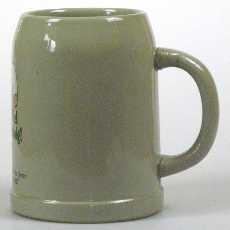 Attribut Wert Alter (min.) Alter (max.) Identifikation (Jever-Fan) ID I002078 / K0175 / B8 Typ Krug Attribute (Allgemein) Form Krug / Seidel Füllstrich geprägt > 0,5l//// Hersteller-Zeichen WW Inhalt (l) 0,50 Logo Pilsener 2 Maße HxBxT (cm) 12,7x9,9x9,9 Material Steingut Motiv Rundliche Schrift Sorte Pilsener Attribute (Zeitstempel) Eigene 19770922, 19770923 22.09.1977 23.09.1977