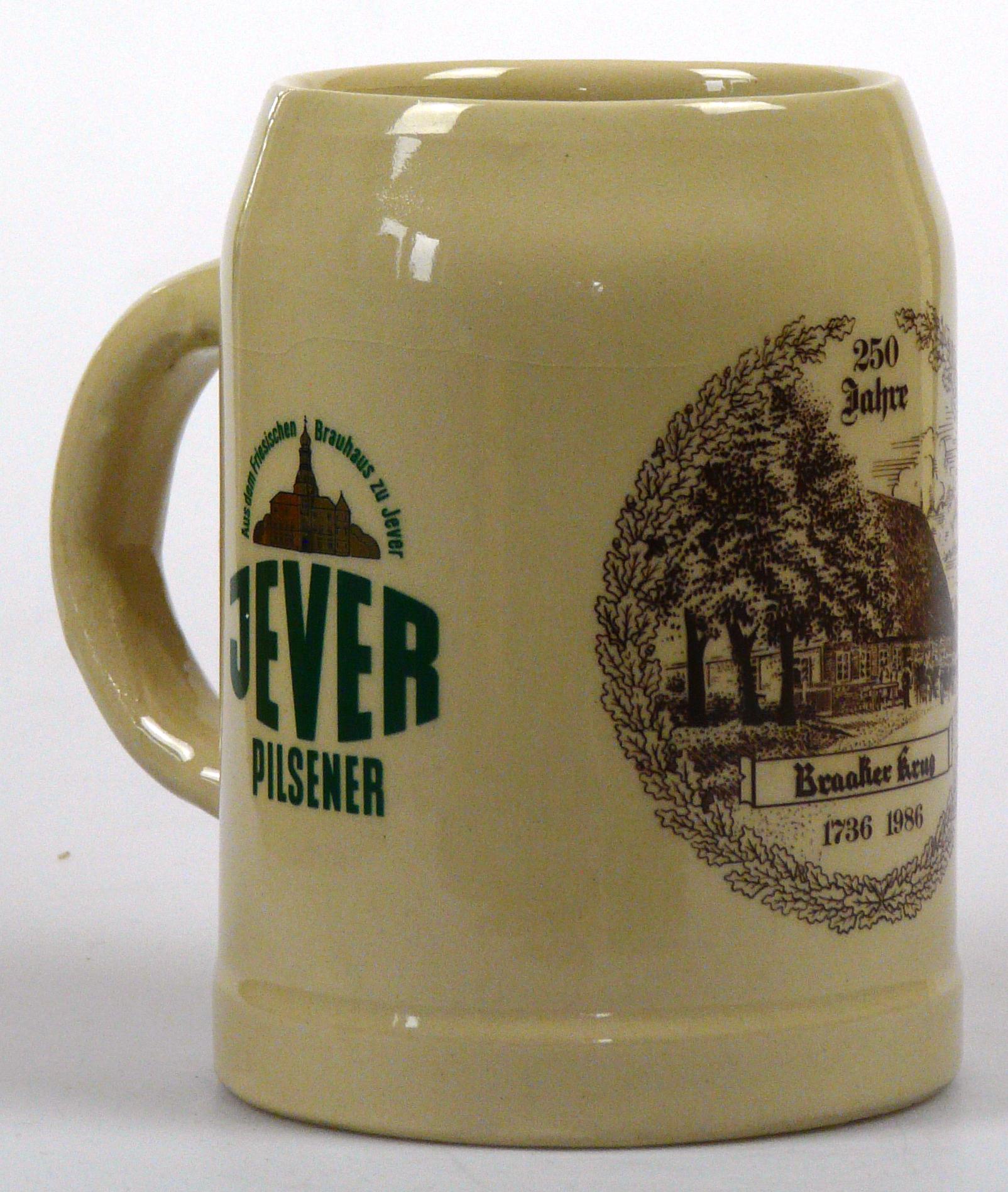 Attribut Wert Alter (min.) Alter (max.) Identifikation (Jever-Fan) ID I002100 / K0197 / B9 Typ Krug Attribute (Allgemein) Event 250 Jahre Braaker Krug Form Krug / Seidel Füllstrich geprägt > 0,5l////sahm Gastronomie Braaker Krug Herstellername SAHM GmbH & Co. KG Hersteller-Zeichen sahm Inhalt (l) 0,50 Logo Pilsener 1 Maße HxBxT (cm) 13,1x9,9x9,9 Material Steingut Sorte Pilsener Attribute (Zeitstempel) Eigene 19860000 1986 1986