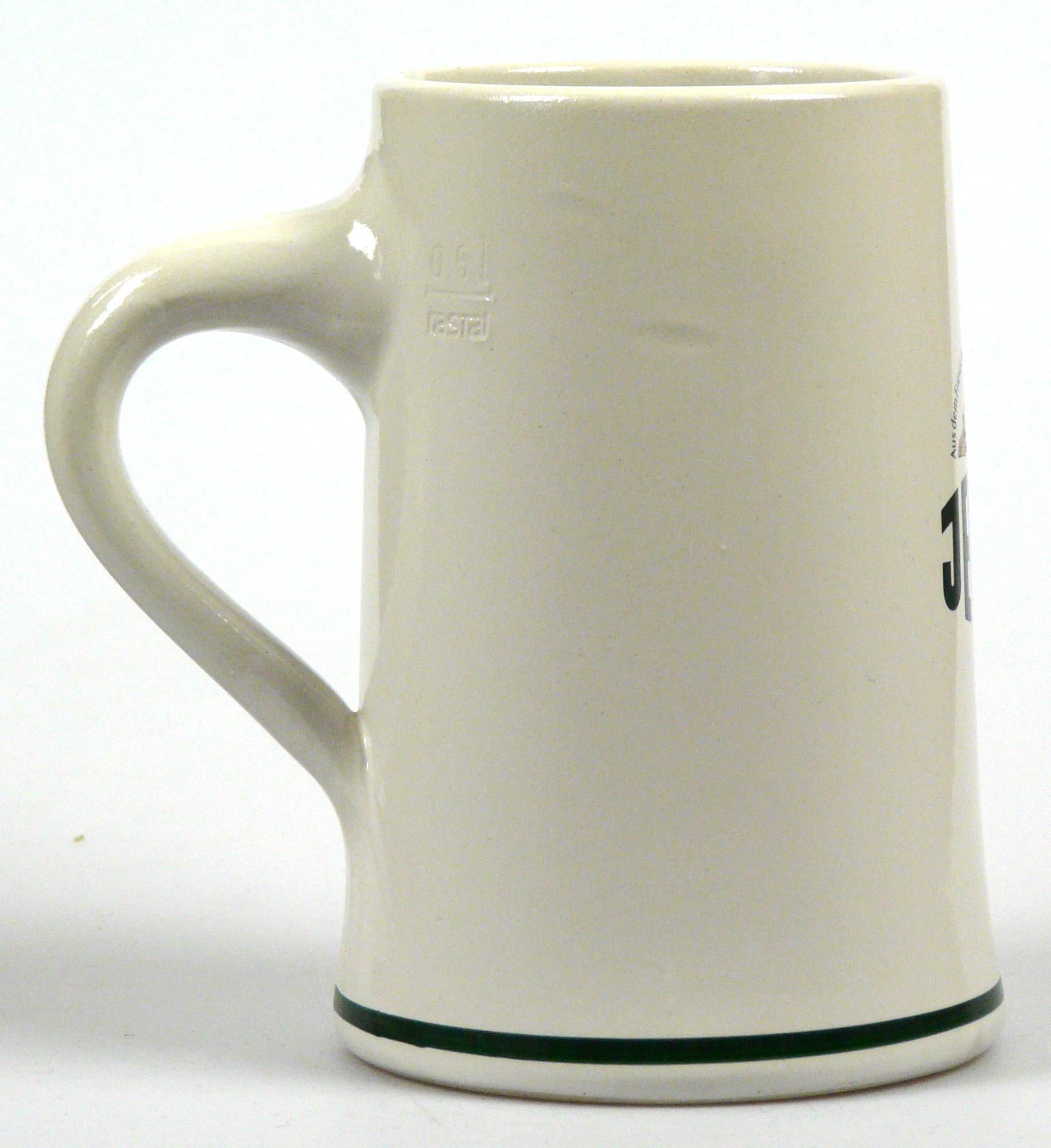 Attribut Wert Alter (min.) Alter (max.) Identifikation (Jever-Fan) ID I002106 / K0201 / B14 Typ Krug Attribute (Allgemein) Form Krug / Seidel Füllstrich geprägt > 0,5l////rastal Herstellername Rastal GmbH & Co. KG Hersteller-Zeichen rastal Inhalt (l) 0,50 Logo Dachmarke 3 Maße HxBxT (cm) 14,6x10,1x10,1 Material Steingut Sorte (Dachmarke)