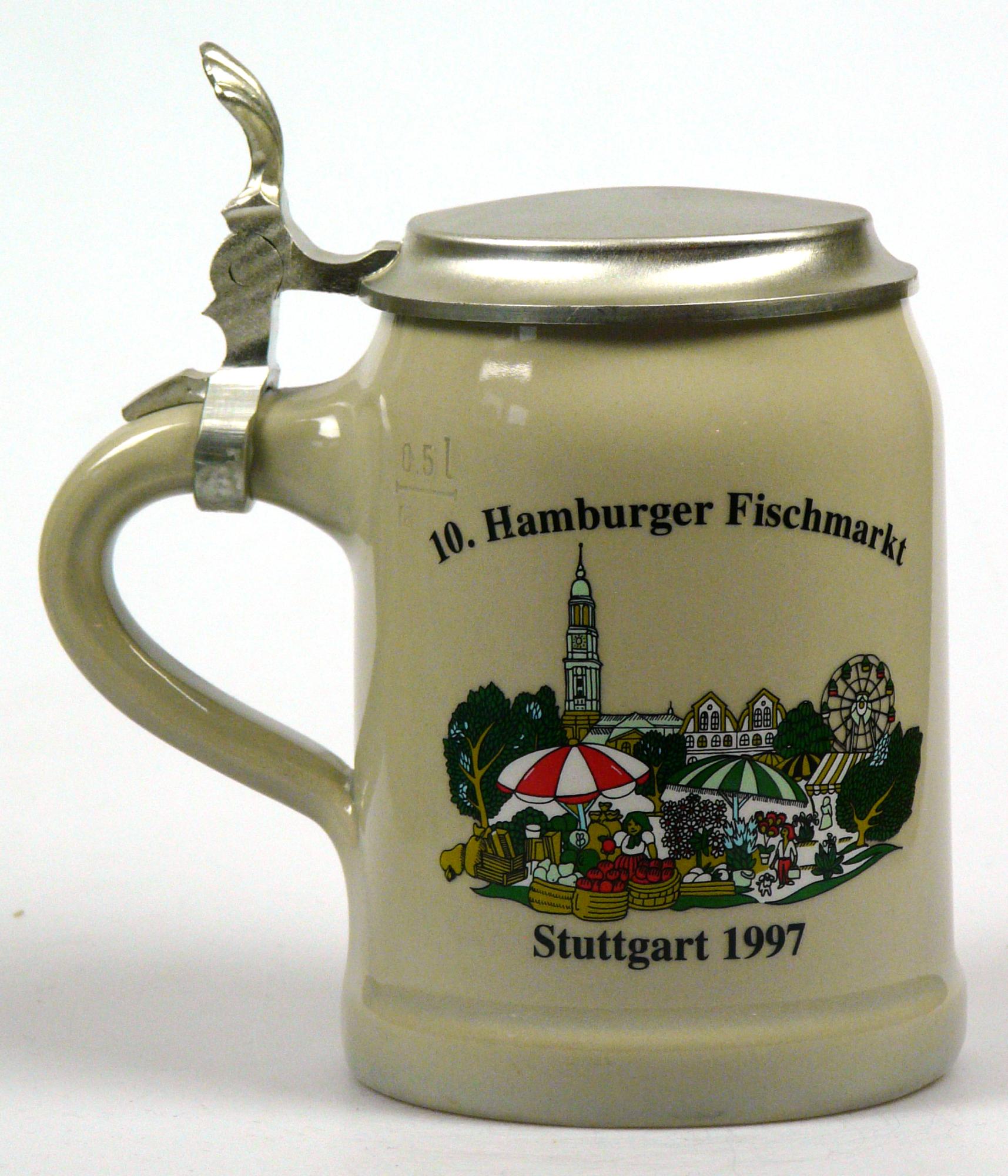 Attribut Wert Alter (min.) Alter (max.) Identifikation (Jever-Fan) ID I002120 / K0215 / B13 Typ Krug Attribute (Allgemein) Event Hamburger Fischmarkt Form Krug / Seidel Füllstrich geprägt > 0,5l////rastal Herstellername Rastal GmbH & Co. KG Hersteller-Zeichen rastal Inhalt (l) 0,50 Logo Pilsener 13 Maße HxBxT (cm) 16,3x9,8x9,8 Material Steingut Material Zinn Ort Stuttgart > Stuttgart > Stuttgart > Baden-Württemberg > Deutschland Sorte Pilsener Attribute (Zeitstempel) Eigene 19970000 1997 1997