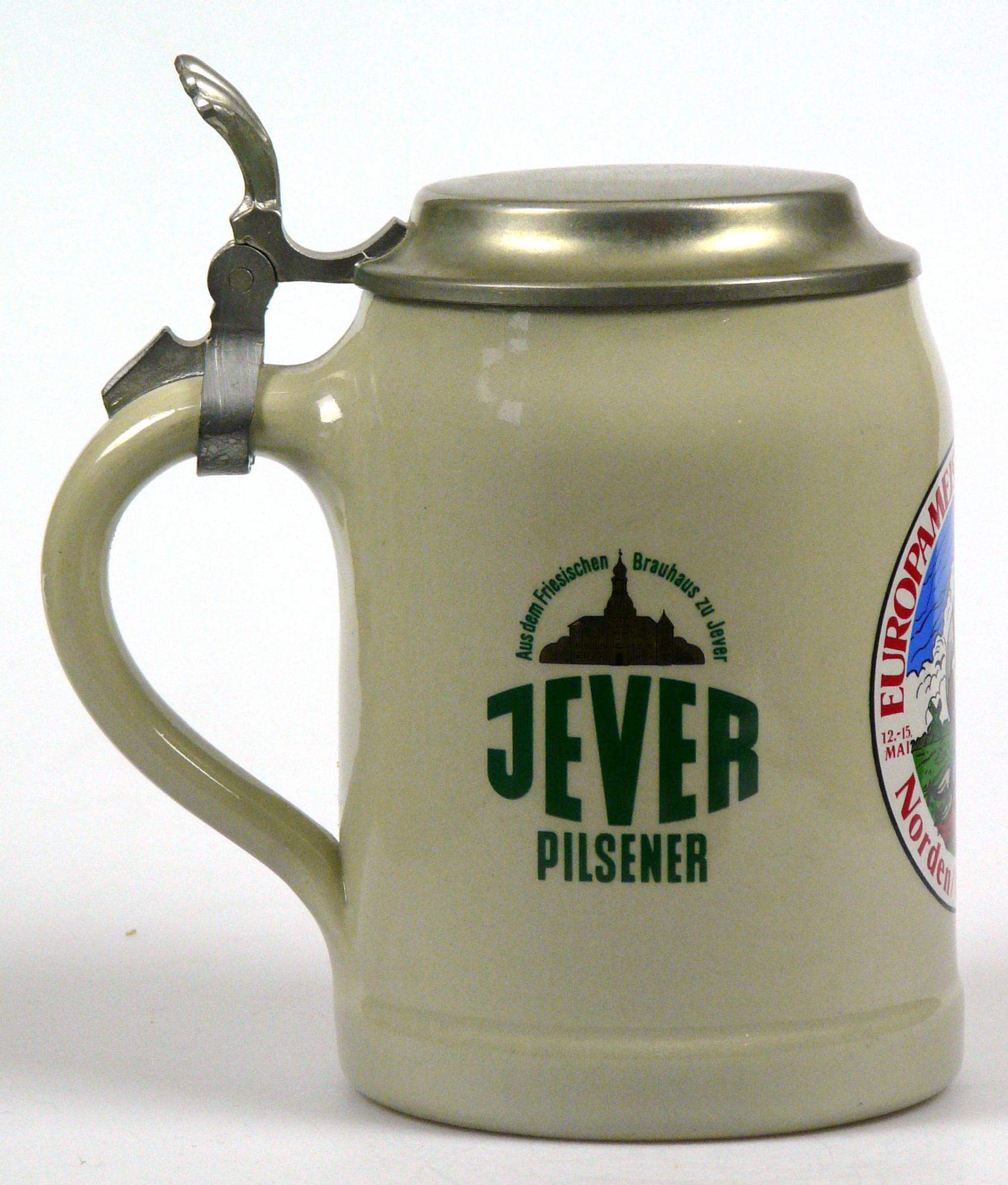Ein paar Fakten von einem Insider: der Bierkrug wurde speziell für die Europameisterschaften der Klootschießer und Boßler in sehr geringer Stückzahl hergestellt. An den Wettkämpfen haben Sportler aus Ostfriesland/Oldenburg, Schleswig-Holstein, Holland und Irland teilgenommen. Dieser Krug war nicht im freien Handel erhältlich; es gab ihn nur im speziellen Souvenirshop auf dem Gelände zu erwerben, wo er damals schon am ersten Tag ausverkauft war.