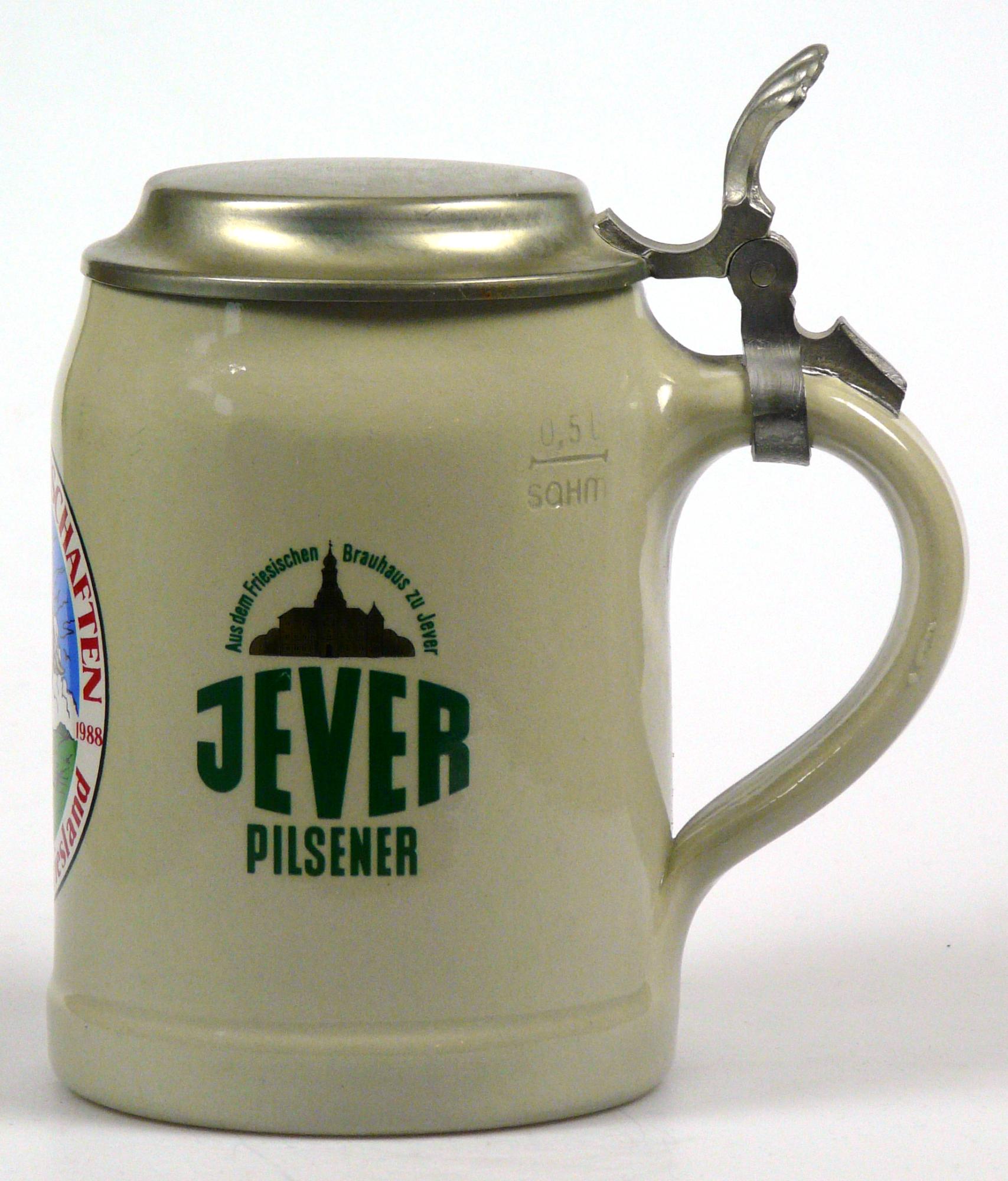 Attribut Wert Alter (min.) Alter (max.) Identifikation (Jever-Fan) ID I002125 / K0220 / B13 Typ Krug Attribute (Allgemein) Event Europameisterschaften Norden Form Krug / Seidel Füllstrich geprägt > 0,5l////sahm Herstellername SAHM GmbH & Co. KG Hersteller-Zeichen sahm Inhalt (l) 0,50 Logo Pilsener 1 Maße HxBxT (cm) 16,1x9,8x9,8 Material Steingut Material Zinn Ort Norden > Norden > Landkreis Aurich > Niedersachsen > Deutschland Sorte Pilsener Attribute (Zeitstempel) Eigene 19880512, 19880513, 19880514, 19880515 12.05.1988 15.05.1988