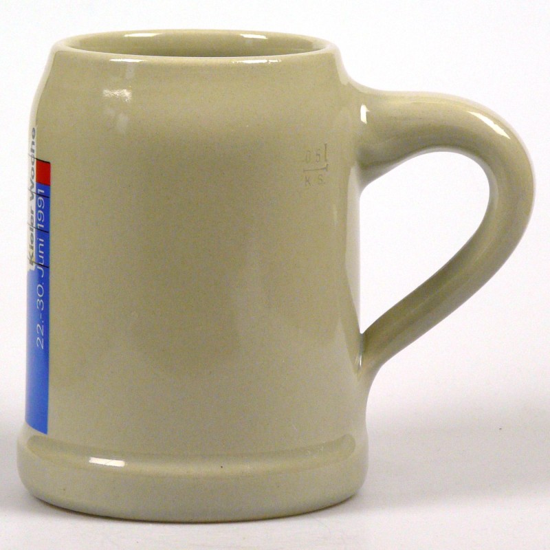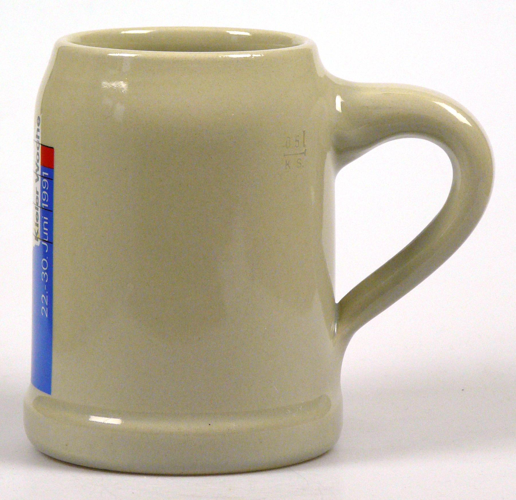 Attribut Wert Alter (min.) Alter (max.) Identifikation (Jever-Fan) ID I002140 / K0235 / B12 Typ Krug Attribute (Allgemein) Event Kieler Woche Form Krug / Seidel Füllstrich geprägt > 0,5l////K.S. Hersteller-Zeichen KS Inhalt (l) 0,50 Logo Pilsener 13 Maße HxBxT (cm) 12,7x10x10 Material Steingut Ort Kiel > Kiel > Kiel > Schleswig-Holstein > Deutschland Sorte Pilsener Attribute (Zeitstempel) Eigene 19910622, 19910623, 19910624, 19910625, 19910626, 19910627, 19910628, 19910629, 19910630 22.06.1991 30.06.1991