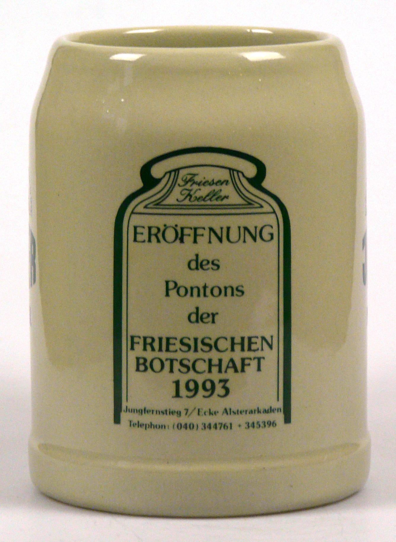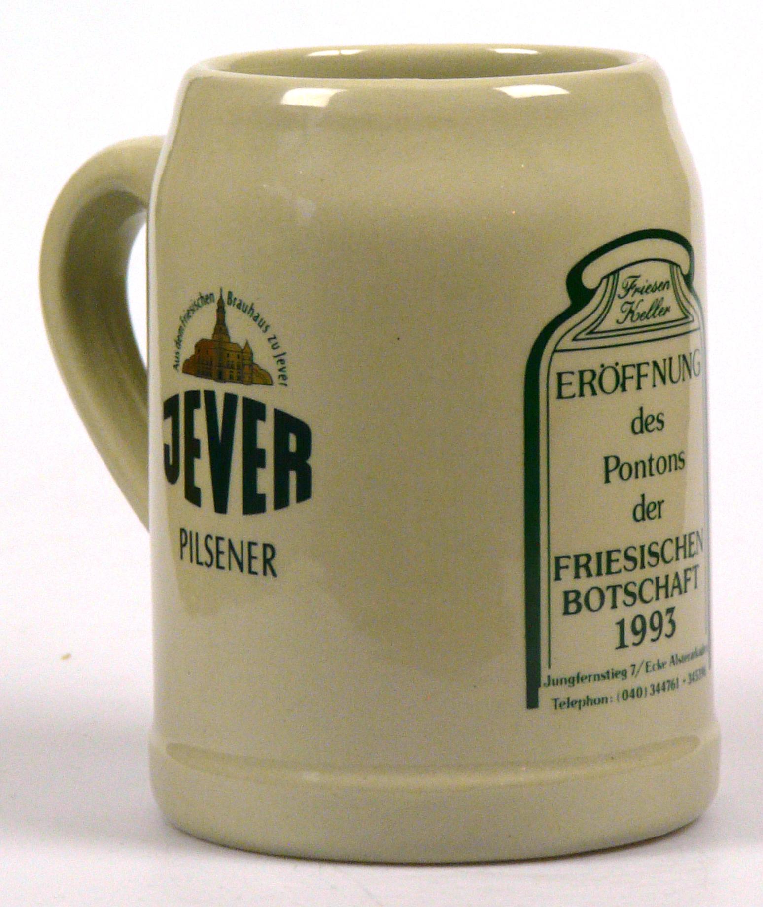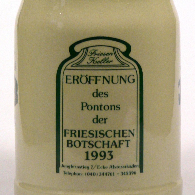 Attribut Wert Alter (min.) Alter (max.) Identifikation (Jever-Fan) ID I002146 / K0241 / B11 Typ Krug Attribute (Allgemein) Event Friesische Botschaft - Ponton-Eröffnung Form Krug / Seidel Füllstrich geprägt > 0,5l////W Gastronomie Friesen-Keller Hersteller-Zeichen W Inhalt (l) 0,50 Logo Pilsener 13 Maße HxBxT (cm) 13,1x10x10 Material Steingut Ort Hamburg > Hamburg > Hamburg > Hamburg > Deutschland Sorte Pilsener Attribute (Zeitstempel) Eigene 19930000 1993 1993