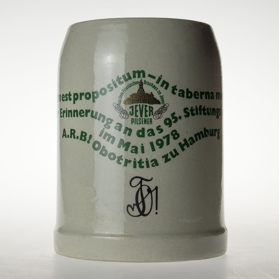 Attribut Wert Alter (min.) Alter (max.) Identifikation (Jever-Fan) ID I002189 / K0284 / B20 Typ Krug Attribute (Allgemein) Event 95. Stiftungsfest A.R.B! Obotritia zu Hamburg Form Krug / Seidel Füllstrich geprägt > 0,5l//// Hersteller-Zeichen WW Inhalt (l) 0,50 Logo Pilsener 9 Maße HxBxT (cm) 12,9x9,9x9,9 Material Steingut Ort Hamburg > Hamburg > Hamburg > Hamburg > Deutschland Sorte Pilsener Attribute (Zeitstempel) Eigene 19780500 05/1978 05/1978