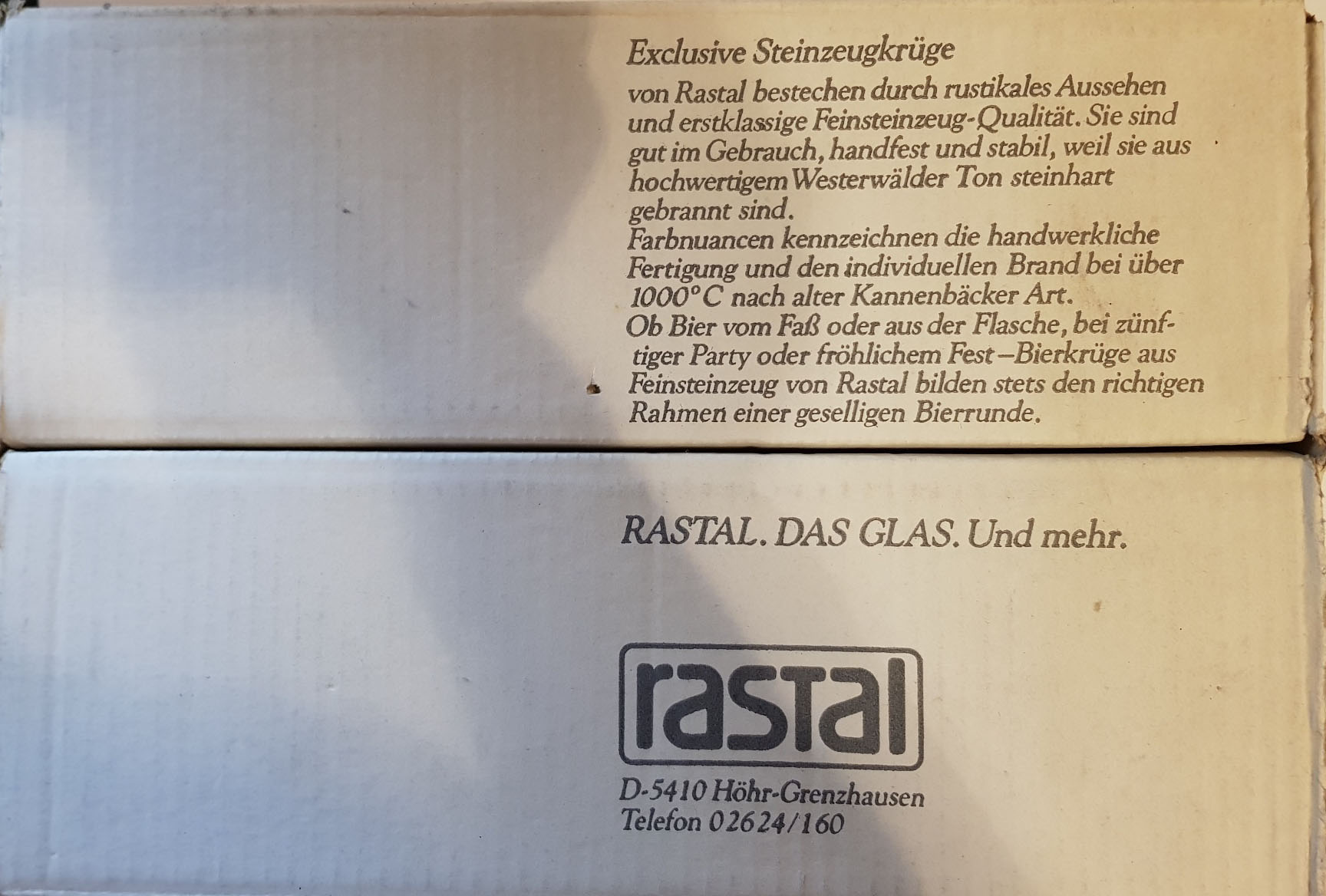 Attribut Wert Alter (min.) Alter (max.) Identifikation (Jever-Fan) ID I002257 / K0345 / B20 Typ Krug Attribute (Allgemein) Form Krug / Seidel Füllstrich geprägt > 0,5l////GERZ Herstellername Rastal GmbH & Co. KG Hersteller-Zeichen GERZ Hersteller-Zeichen rastal Inhalt (l) 0,50 Logo Pilsener 13 Maße HxBxT (cm) 13,2x10x10 Material Steingut Sorte Pilsener Attribute (Zeitstempel) Eigene 19910000 1991 1991