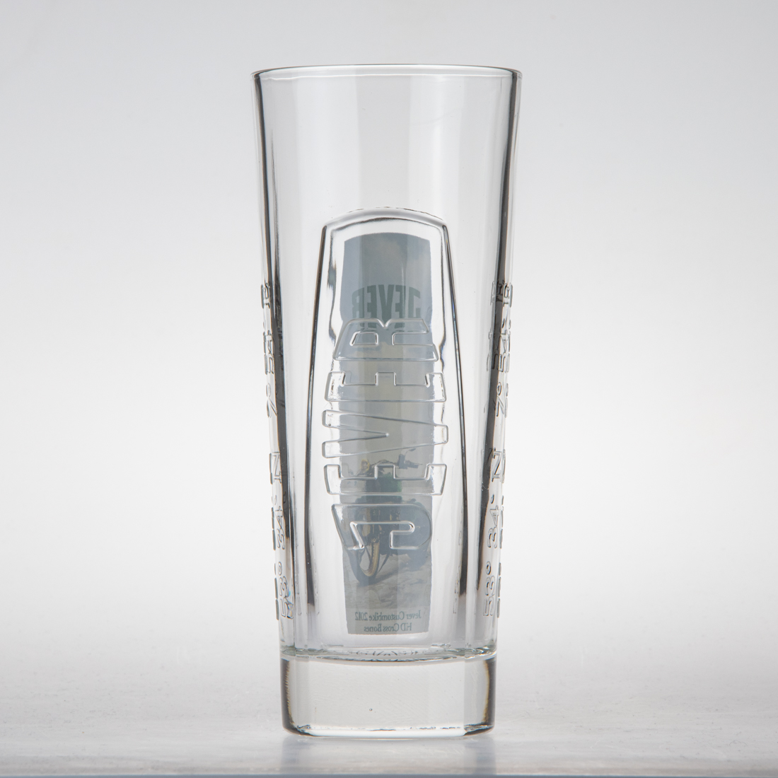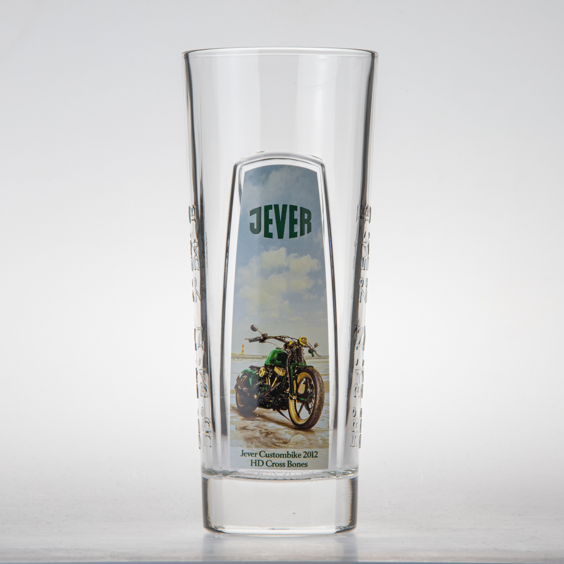 Die Custom Bikes wurden im Auftrag von Jever hergestellt und im Rahmen eines Preisausschreibens verlost. Dieses Glas wurde als Kastenbeilage verschenkt und zeigt eines der zu gewinnenden Bikes.