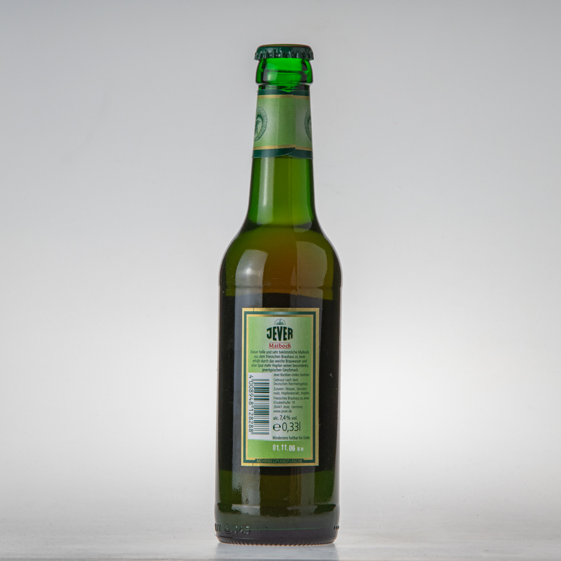 Friesisches Brauhaus / JEVER / Maibock / Dieser helle und sehr bekömmliche Maibock aus dem friesischen Brauhaus zu Jever erhält durch das weiche Brauwasser und eine Spur mehr Hopfen seinen besonderen jevertypischen Geschmack. / Jever Bockbier helles Starkbier / Gebraut nach dem Deutschen Reinheitsgebot. / Zutaten: Wasser, Gerstenmalz, Hopfenextrakt, Hopfen / Friesisches Brauhaus zu Jever Elisabethufer 18 26441 Jever, Germany www.jever.de / alc. 7,4% vol. / e 0,33l / Mindestens haltbar bis: / 4 008948 128288 / MEHRWEGPFANDFLASCHE