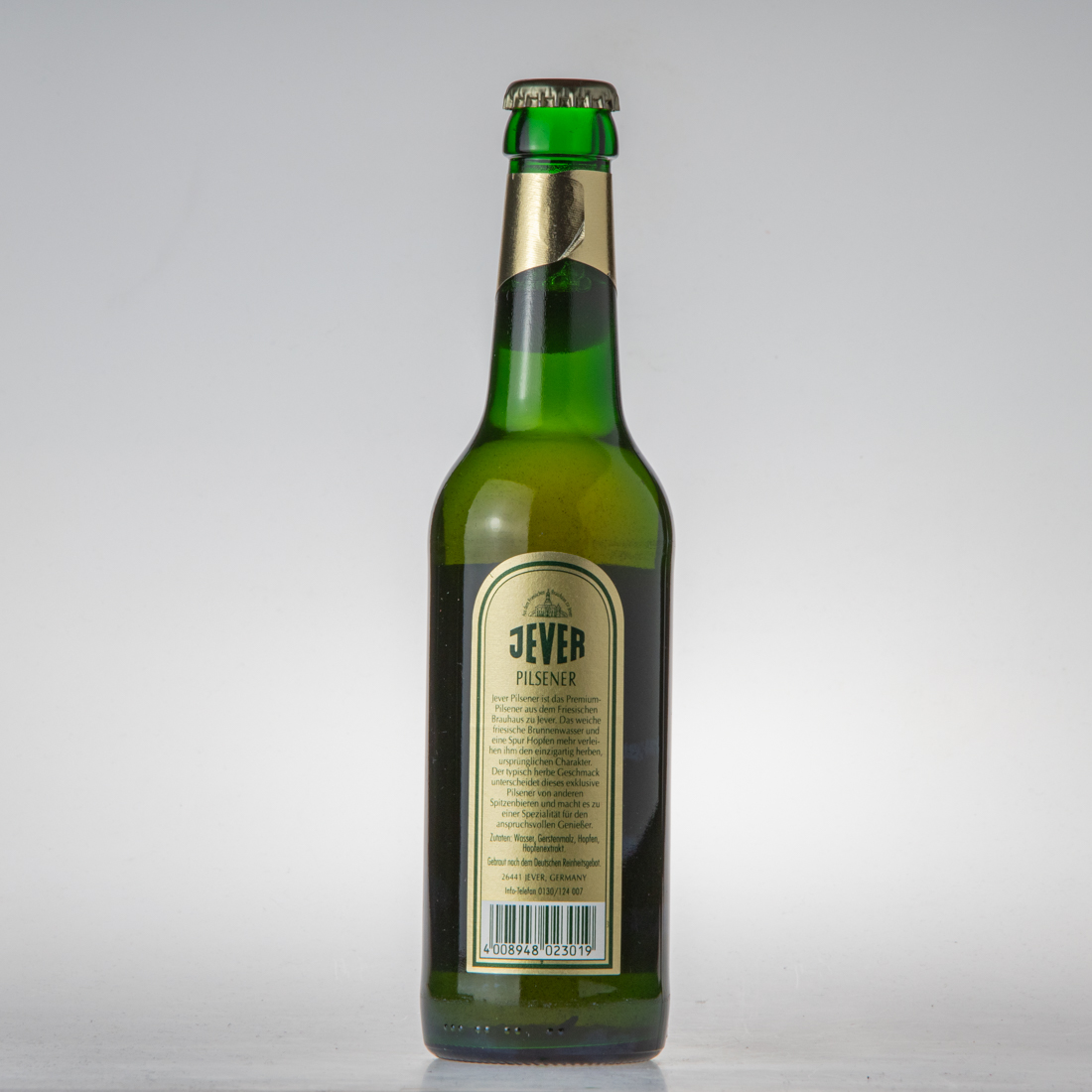 Aus dem Friesischen Brauhaus zu Jever / JEVER / PILSENER / Jever Pilsener ist das Premium-Pilsener aus dem Friesischen Brauhaus zu Jever. Das weiche friesische Brunnenwasser uund eine Spur Hopfen mehr verleihen ihm den einzigartig herben, ursprünglichen Charakter. Der typisch herbe Geschmack unterscheidet dieses exclusive Pilsener von anderen Spitzenbieren und macht es zu einer Spezialität für den anspruchsvollen Genießer. / Zutaten: Wasser, Gerstenmalz, Hopfen, Hopfenextrakt. / Gebraut nach dem Deutschen Reinheitsgebot. / 26441 JEVER, GERMANY / Info-Telefon 0130/124007 / 4 008948 023019 / Aus dem Friesischen Brauhaus zu Jever / JEVER / PILSENER