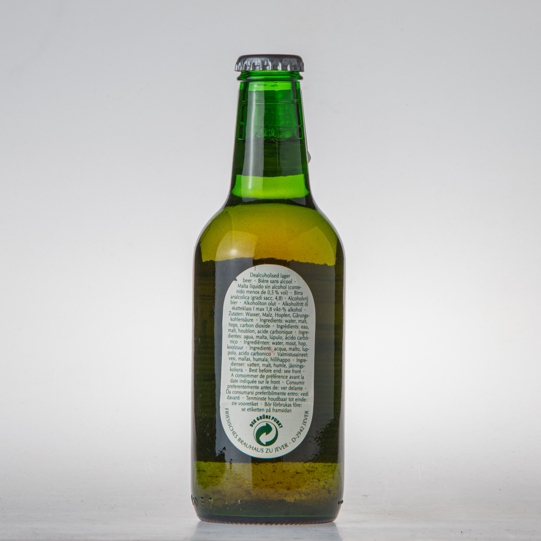 Dealcoholised lager beer Biere sans alcool Malta liquido sin alcohol (contenido menos de 0,5% vol) Birra analcolica (gradi sacc. 4,8) Alcoholvrij bier Alkoholiton olut Alkoholfritt öl skatteklas I max 1,8 vikt-% alkohol / Zutaten: Wasser, Malz, Hopfen, Gärungskohlensäure / Ingredients: eau, malt, houblon, acide carbonique Ingredientes: agua, malta, lupulo, acido carbonico Ingredienten: water, mout, hop, koolzuur Ingredienti: acqua, malto, luppolo, acido carbonico Valmistusaineet: vesi, mallas, humala, hiilihappo Ingredienser: vatten, malt, humle, jäsningskolsyra / Best before end: see front A consommer de preference avant la date indiquee sur le front Consumir preferentemente antes de: ver delante Da consumarsi preferibilmente entro: vedi davanti Tenminste houdbar tot einde: zie vooretiket Bör Förbrukas före: se etiketten pa framsidan / DER GRÜNE PUNKT / FRIESISCHE BRAUHAUS ZU JEVER D-2942 JEVER