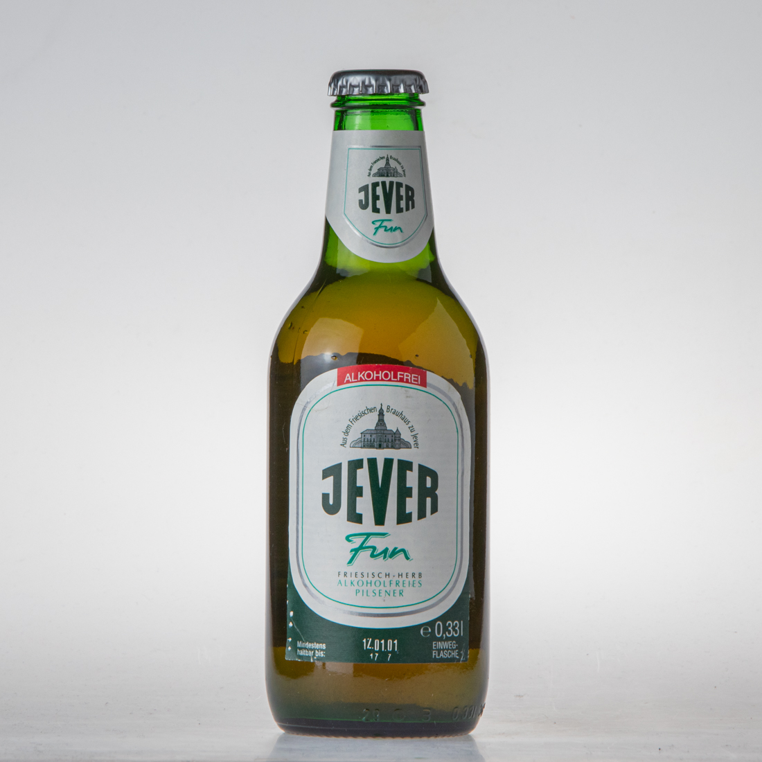 Aus dem Friesischen Brauhaus zu Jever / JEVER / Fun / ALKOHOLFREI / Aus dem Friesischen Brauhaus zu Jever / JEVER / Fun / FRIESISCH-HERB / ALKOHOLFREIES PILSENER / Mindestens haltbar bis: / e 0,33l EINWEG-FLASCHE