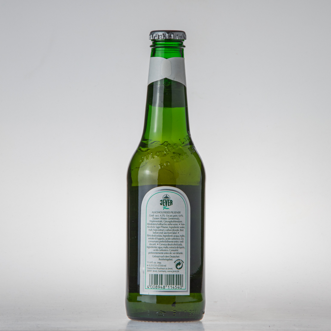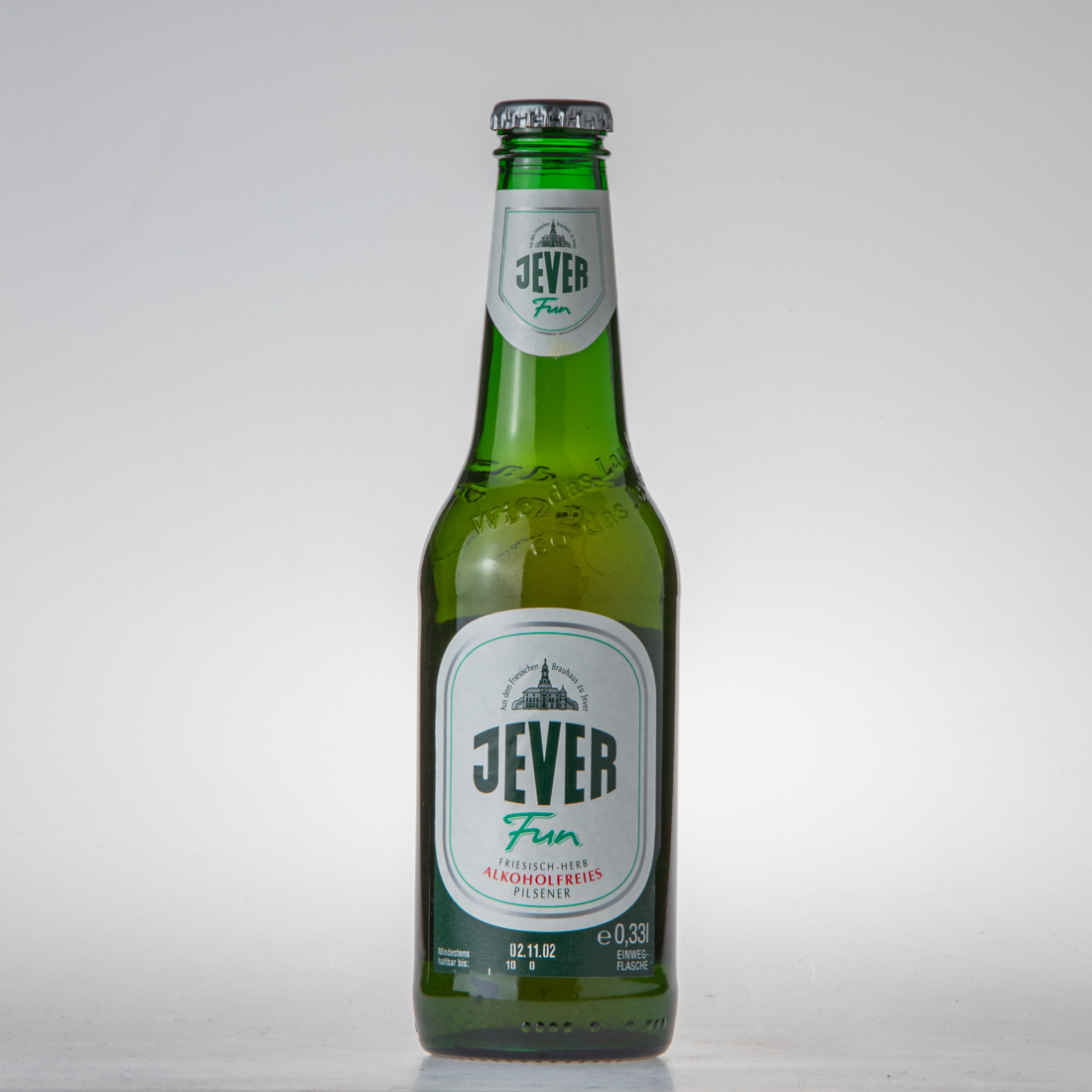 Aus dem Friesischen Brauhaus zu Jever / JEVER / Fun / ALKOHOLFREIES PILSENER / Gradi sacc. 4,5% Ext. sec. prim. 4,4% / Zutaten: Wasser, Gerstenmalz, Hopfenextrakt, Gärungskohlensäure. / Mindestens haltbar bis: siehe vorne / Non-Alcoholic lager Pilsener, Ingredients: water, malt, hops extract, carbon dioxide. Best before end: see front label. / Birra dealcoolata, Ingredienti: acqua, malto, estratto di luppolo, acido carbonico. Da consumarsi preferibilmente entro: vedi davanti. Cerveza desalcoholizada, Ingredientes: agua, malta, extracto de lupolo, acido carbonico. Consumir preferentemente antes de: ver delante. / Gebraut nach dem Deutschen Reinheitsgebot. / 11.6 fl. oz. imp. / e 0,33l/33cl/330ml / Friesisches Brauhaus zu Jever, 26441 Jever, Germany, www.jever.de / DER GRÜNE PUNKT / 4 008948 114540 / Prägung Flaschenschulter: Wie das Land, so das Jever