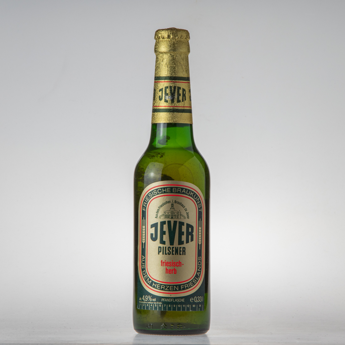 JEVER / FRIESISCHE BRAUKUNST / Aus dem Friesischen Brauhaus zu Jever / JEVER / PILSENER / friesisch-herb / AUS DEM HERZEN FRIESLANDS / alc. 4,9% vol PFANDFLASCHE e 0,33l / Mindestens haltbar bis Ende: