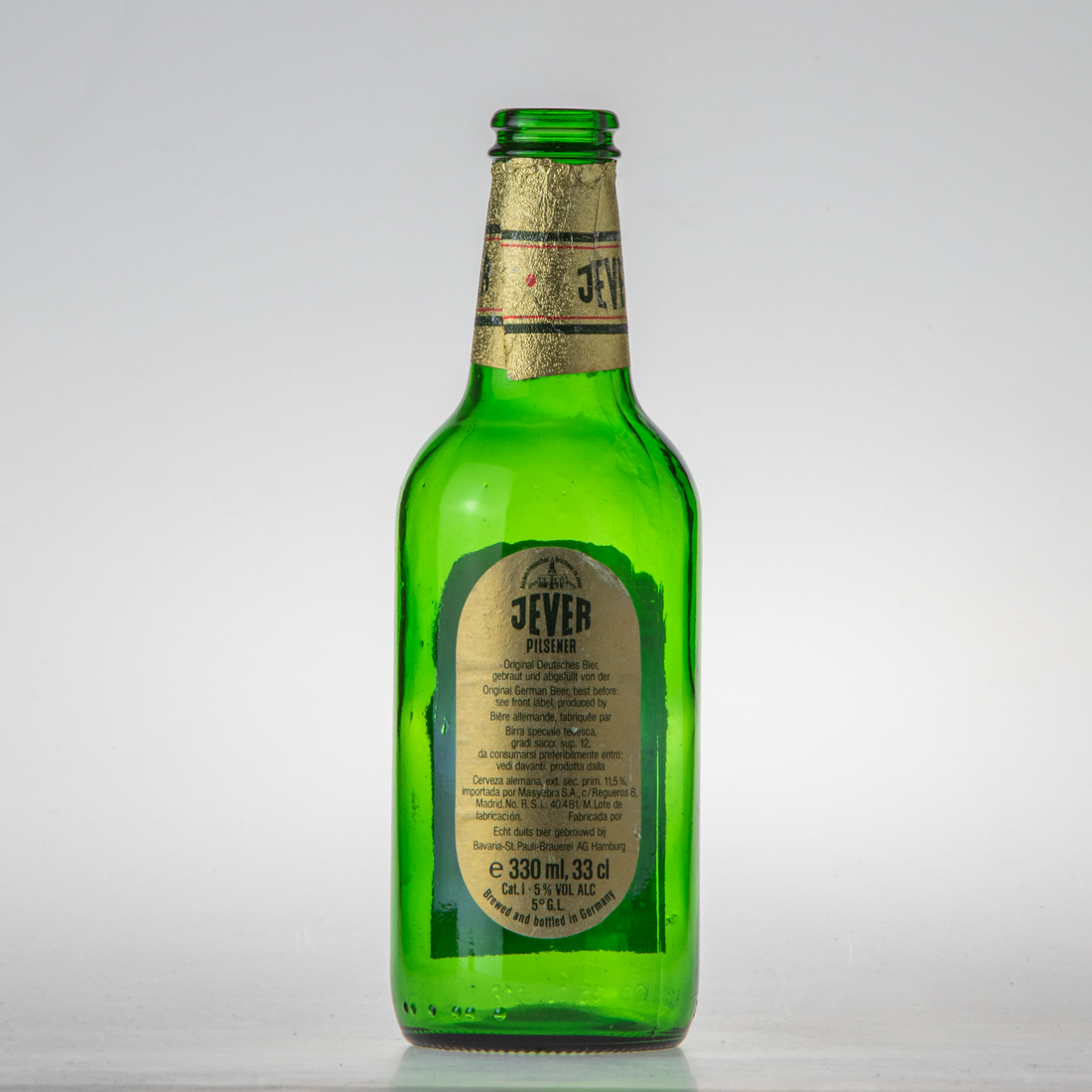 Aus dem Friesischen Brauhaus zu Jever / JEVER / PILSENER / Original Deutsches Bier gebraut und abgefüllt von der Original German Beer, best before: see front label, produced by Biere allemande, fabriquee par Birra speciale tedesca, gradi saccr. sup. 12, da consumarsi preferibilmente entro: vedi davanti, prodotta dalla Cerveza alemana, ext. sec. prim. 11,5% importada por Masyebra S.A, c/Regueros 8, Madrid. No. R.S.i.: 40.481/M.Lote de Fabricacion Fabricada por Ech duits bier gebrouwd bij Bavaria-St.Pauli-Brauerei AG Hamburg / e 330ml, 33cl / Cat. I 5% VOL ALC / 5° G.L. / Brewed and bottled in Germany