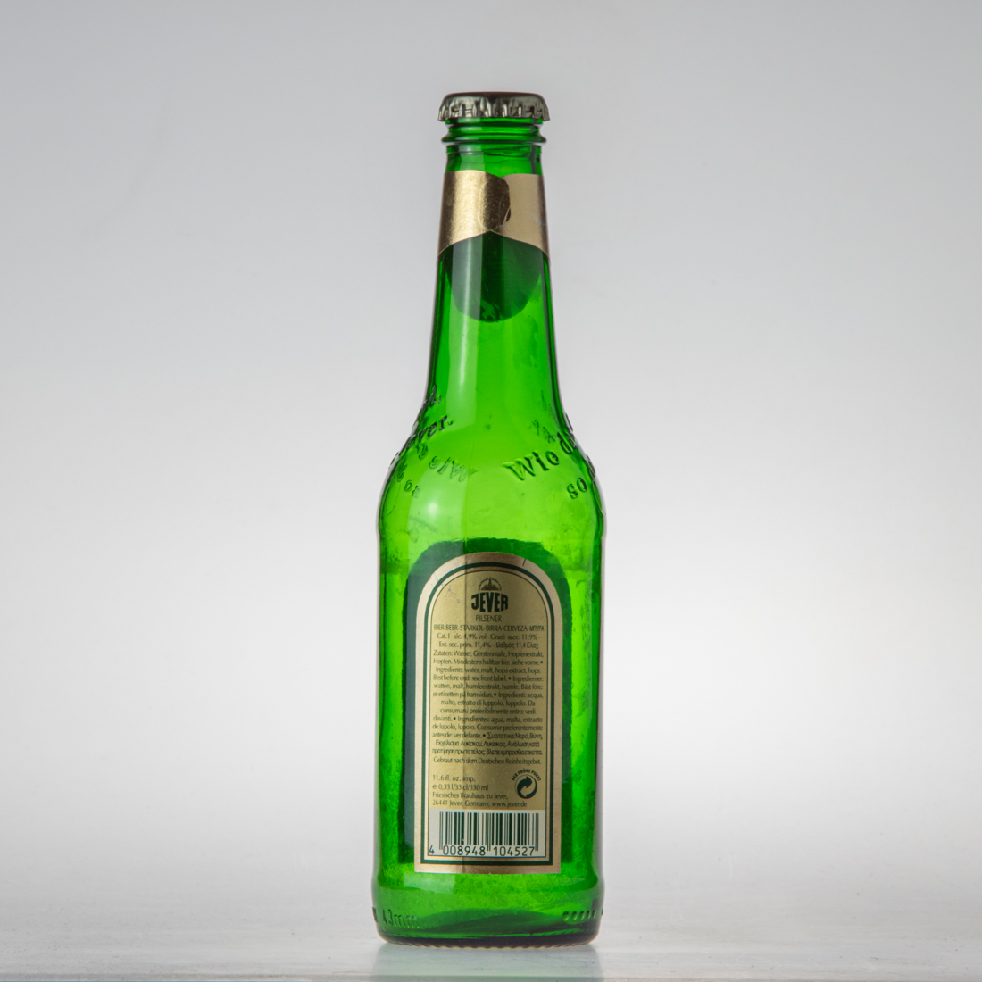 Aus dem Friesischen Brauhaus zu Jever / JEVER / BIER BEER STARKÖL BIRRA CERVEZA … / Cat. I alc 4,9% vol Gradi sacc. 11,9% Ext. sec. prim. 11,4% … 11,4 … Zutaten: Wasser, Gerstenmalz, Hopfenextrakt, Hopfen. Mindestens haltbar bis: siehe vorne. Ingredients: water, malt, hops extract, hops. Best before end: see front label … Ingredienser: watten, malt, humleextrakt, humle Bäst före: se etiketten pa framsidan Ingredienti: acqua malto estratto di luppolo luppolo Consumir preferentemente antes de: ver delante Gebraut nach dem Deutschen Reinheitsgebot. / 11.6 fl. oz. imp. 1506-3 / e 0,33l/33cl/330ml / Friesisches Brauhaus zu Jever, 26441 Jever, Germany, www.jever.de / DER GRÜNE PUNKT / 4 008948 104527