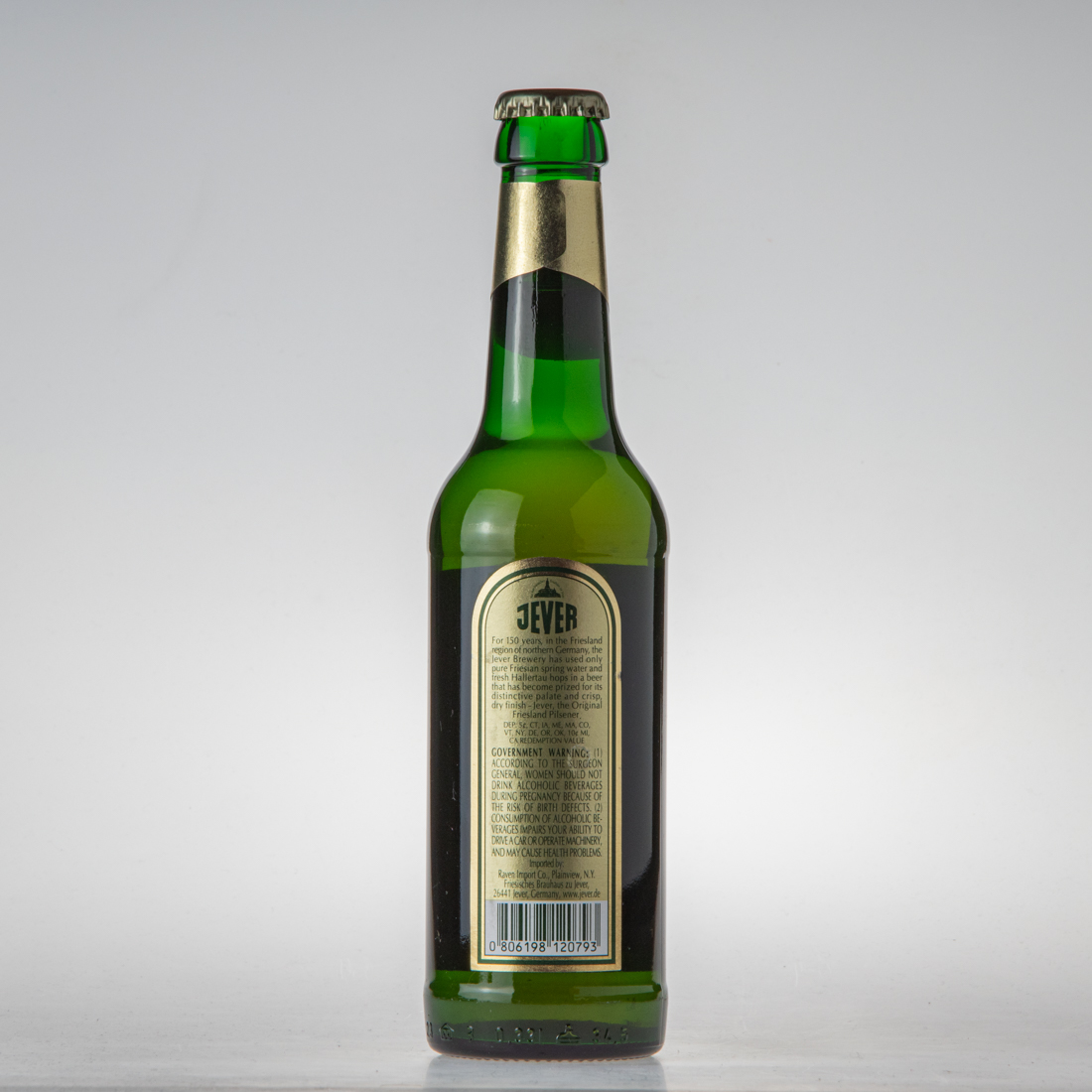Aus dem Friesischen Brauhaus zu Jever / JEVER / For 150 years, in the Friesland region of northern Germany, the Jever Brewery has used only pure Friesian spring water and fresh Hallertau hops in a beer that has become prized for its distinctive palate and crisp, dry finsih - Jever, the Original Friesland Pilsener. / DEP- 5c, CT, IA, ME, MA, CO, VT, NY, DE, OR, OK, 10c MI, CA REDMPTION VALUE / GOVERNMENT WARNING: (1) ACCORDING TO THE SURGEON GENERAL , WOMEN SHOULD NOT DRINK ALCOHOLIC BEVERAGES DURING PREGNANCY BECAUSE OF THE RISK OF BIRTH DEFECTS. (2) CONSUMPION OF ALCOHOLIC BEVERAGES IMPAIRS YOUR ABILITY TO DRIVE A CAR OR OPERATE MACHINERY, AND MAY CAUSE HEALTH PROBLEMS. / Imported by: Raven Import Co., Plainview, N.Y. / Friesisches Brauhaus zu Jever, 26441 Jever, Germany, www.jever.de / 0 806198 120793
