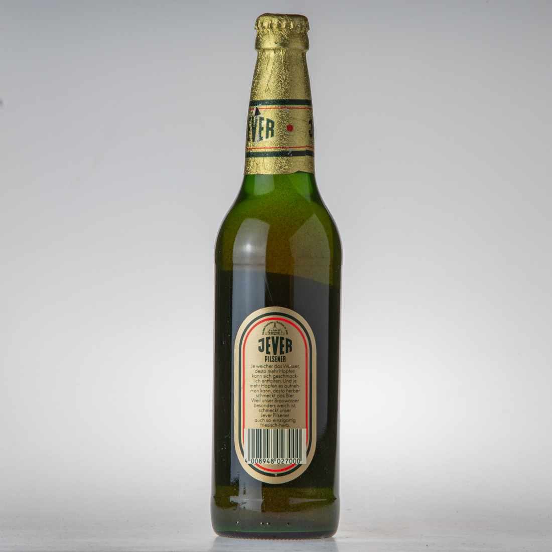 Aus dem Friesischen Brauhaus zu Jever / JEVER / PILSENER / Je weicher das Wasser, desto mehr Hopfen kann sich geschmacklich entfalten. Und je mehr Hopfen es aufnehmen kann, desto herber schmeckt das Bier. Weil unser Brauwasser besonders weich ist, schmeckt unser Jever Pilsener auch so einzigartig friesisch-herb. / 4 008948 027000