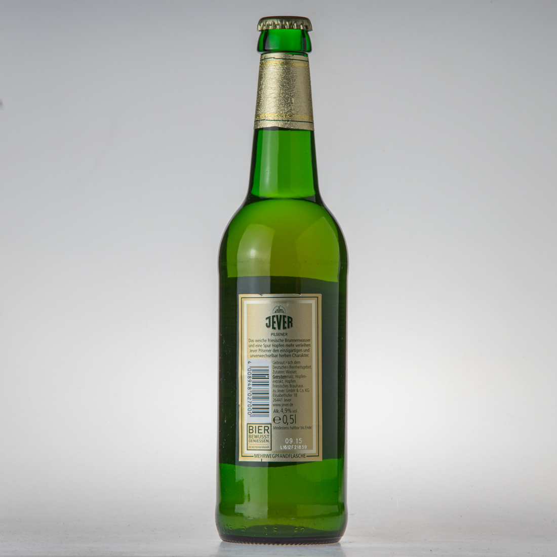 Aus dem Friesischen Brauhaus zu Jever / JEVER / PILSENER / Das weiche friesische Brunnenwasser und eine Spur Hopfen mehr verleihen Jever Pilsener den einzigartigen und unverwechselbar herben Charakter. / Gebraut nach dem Deutschen Reinheitsgebot. / Zutaten: Wasser, Gerstenmalz, Hopfenextrakt, Hopfen. / Friesisches Brauhaus zu Jever GmbH & Co. KG Elisabethufer 18 26441 Jever www.jever.de /Alk. 4,9% vol / e 0,5l / Mindestens haltbar bis Ende: / BIER BEWUSST GENIESSEN DIE DEUTSCHEN BRAUER / MEHRWEGPFANDFLASCHE / 4 008948 027000