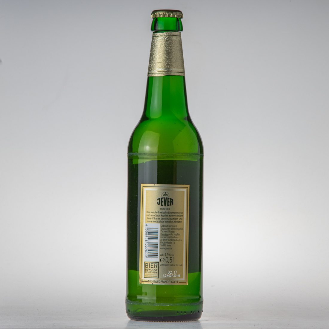 Probieren Sie auch: JEVER FUN. Jever. Keine Kompromisse. / Aus dem Friesischen Brauhaus zu Jever / JEVER / PILSENER / Gebraut nach dem Deutschen Reinheitsgebot. / Zutaten: Wasser, Gerstenmalz, Hopfenextrakt, Hopfen. / Friesisches Brauhaus zu Jever Elisabethufer 18 26441 JEVER, GERMANY www.jever.de / e 0,5l / Mindestens haltbar bis: / MEHRWEGPFANDFLASCHE / 4 008948 027000