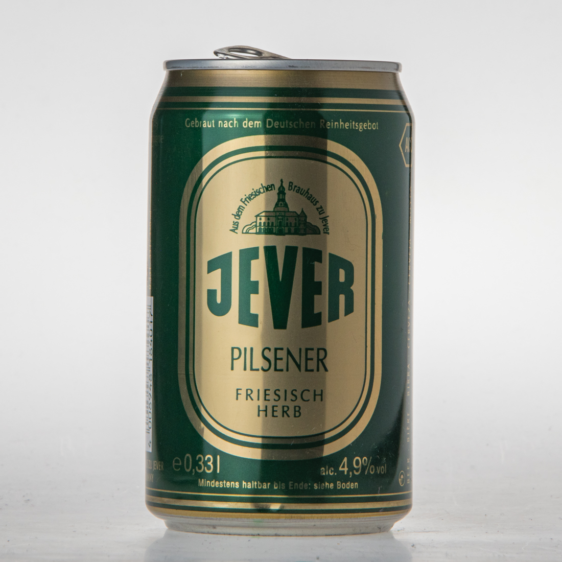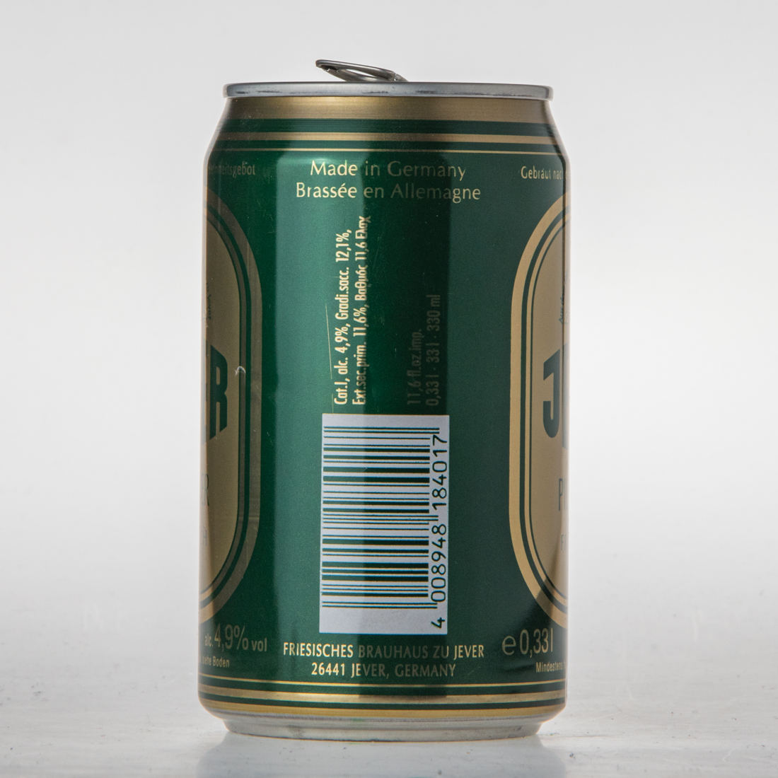 BEER BIERE BIRRA CERVEZA CERVEJA … / Best before end: see bottom of can / A consommer de preference avant la date indiquee sur le fond de la boite / Da consumarsi preferibilmente: vedi fondo / Consumir preferentemente antes de: ver base de la lata / Consumr de preferencia antes de: ver data embaixo da lata / … / ACC DOSEN RECYCLING DER GRÜNE PUNKT / CAT I, alc. 4,9% Gradi sacc. 12,1% Ext. sec. prim. 11,6% … 11,6 … / 11.6 fl. oz. imp. 0,33l 33cl 330ml / Made in Germany Brassee en Allemagne / FRIESISCHES BRAUHAUS ZU JEVER 26441 JEVER, GERMANY / 4 008948 184017
