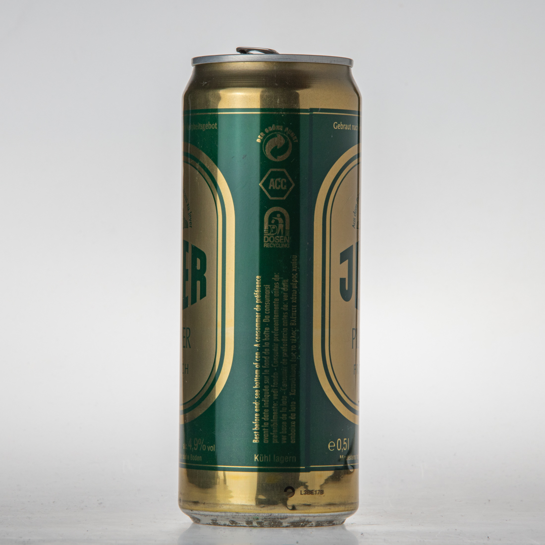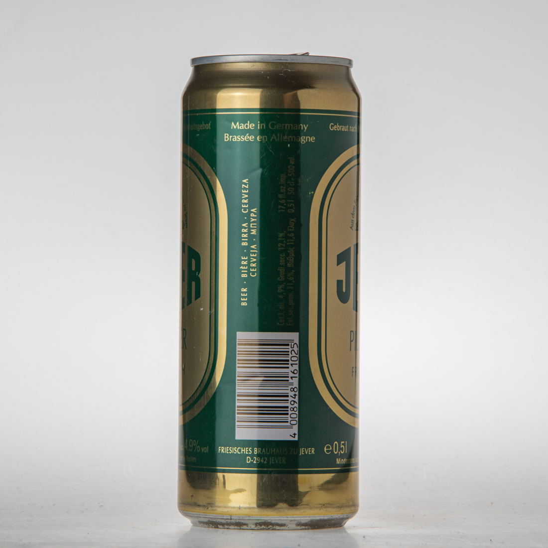 BEER BIERE BIRRA CERVEZA CERVEJA … / CAT I, alc. 4,9% Gradi sacc. 12,1% Ext. sec. prim. 11,6% … 11,6 … / 17.6 fl. oz. imp. 0,5l 50cl 500ml / Made in Germany Brassee en Allemagne / FRIESISCHES BRAUHAUS ZU JEVER D-2942 JEVER / 4 008948 161025 / Best before end: see bottom of can / A consommer de preference avant la date indiquee sur le fond de la boite / Da consumarsi preferibilmente: vedi fondo / Consumir preferentemente antes de: ver base de la lata / Consumr de preferencia antes de: ver data embaixo da lata / … / ACC DOSEN RECYCLING DER GRÜNE PUNKT / Kühl lagern