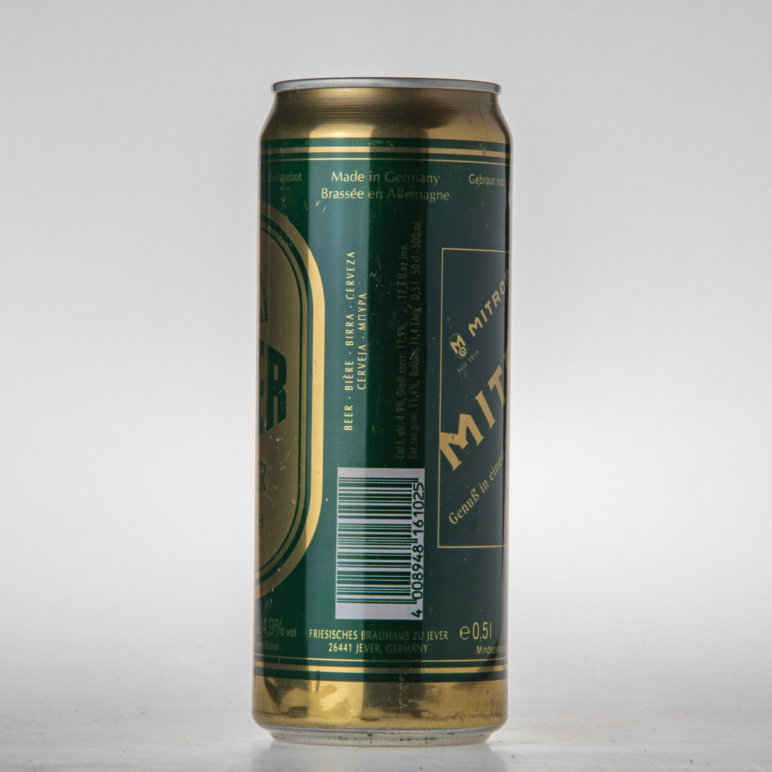 BEER BIERE BIRRA CERVEZA CERVEJA … / CAT I, alc. 4,9% Gradi sacc. 11,9% Ext. sec. prim. 11,4% … 11,4 … / 17.6 fl. oz. imp. 0,5l 50cl 500ml / Made in Germany Brassee en Allemagne / FRIESISCHES BRAUHAUS ZU JEVER 26441 JEVER, GERMANY / 4 008948 161025 / Best before end: see bottom of can / A consommer de preference avant la date indiquee sur le fond de la boite / Da consumarsi preferibilmente: vedi fondo / Consumir preferentemente antes de: ver base de la lata / Consumr de preferencia antes de: ver data embaixo da lata / … / ACC DOSEN RECYCLING DER GRÜNE PUNKT / Kühl lagern