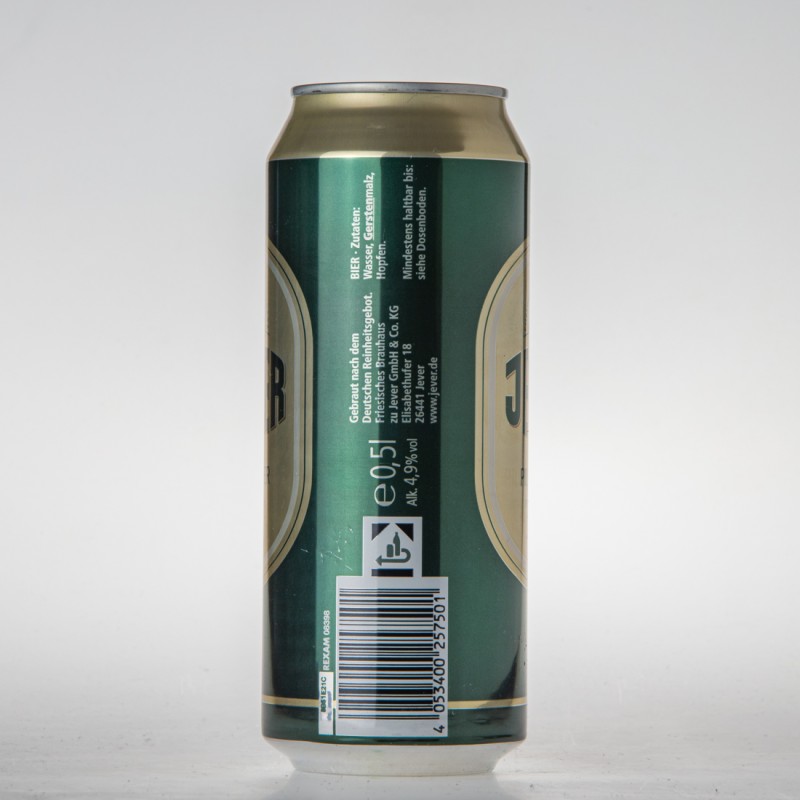 AL DOSEN RECYCLING / Das weiche friesische Brunnenwasser und eine Spur Hopfen mehr verleihen Jever Pilsener den einzigartigen und unverwechselbar herben Charakter / BIER BEWUSST GENIESSEN DIE DEUTSCHEN BRAUER / e 05,l Alk. 4,9% vol / Gebraut nach dem Deutsche Reinheitsgebot / Friesisches Brauhaus zu Jever GmbH & Co. KG Elisabethufer 18 26441 Jever www.jever.de / BIER Zutaten: Wasser, Gerstenmalz, Hopfen / Mindestens haltbar bis: siehe Dosenboden / 4 053400 257501