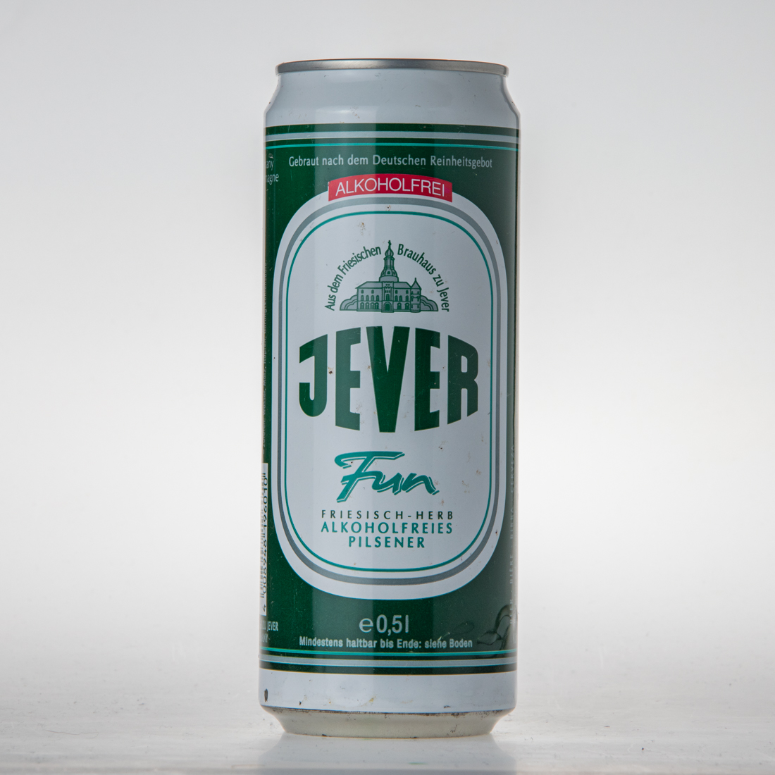 BEER BIERE BIRRA CERVEZA / Best before end: see bottom of can Consommer de preference avant de la date indiquee sur le fond de la boite Da consumarsi preferibilmente: vedi fondo Consumir preferentemente antes de: ver base de la lata Gradi.sacc. 4,5%, Ext.sec.prim. 4,4% 17,6 fl.oz.imp., 0,5l 50cl 500ml / 100ml enthalten: 2,8g Kohlenhydrte, 76kJ (18kcal) / DER GRÜNE PUNKT ACC DOSEN RECYCLING / Kühl lagern / Made in Germany / Brassee en Allemagne / Dealocoholized lager beer Ingredients: water, malt, hops extract, carbon dioxide / Biere desalcoholisee Ingredients: eau, malt, houblon, acide carbonique Birra dealcoolata (gradi.sacc. 4,5%) Ingredienti: acqua, malta, lupolo, acido carbonico / Cerveza desalcoholizada (contenido menos de 0,5%) Ingredientes: agua, malta, extracto lupolo, acido carbonico / Zutaten: Wasser, Gerstenmalz, Hopfenextrakt, Gährungskohlensäure / 4 008948 196010 / FRIESISCHES BRAUHAUS ZU JEVER 26441 JEVER, GERMANY