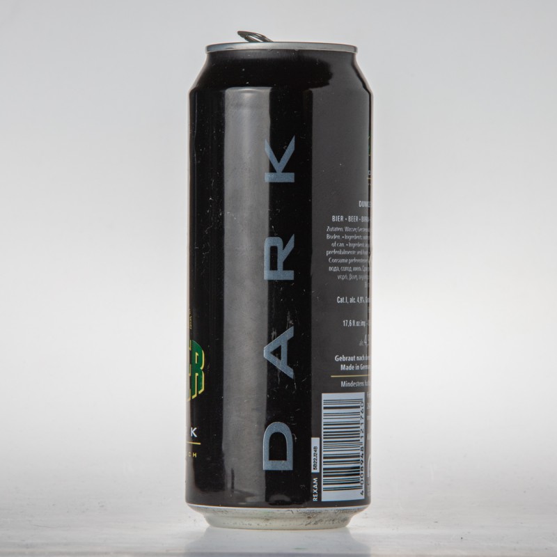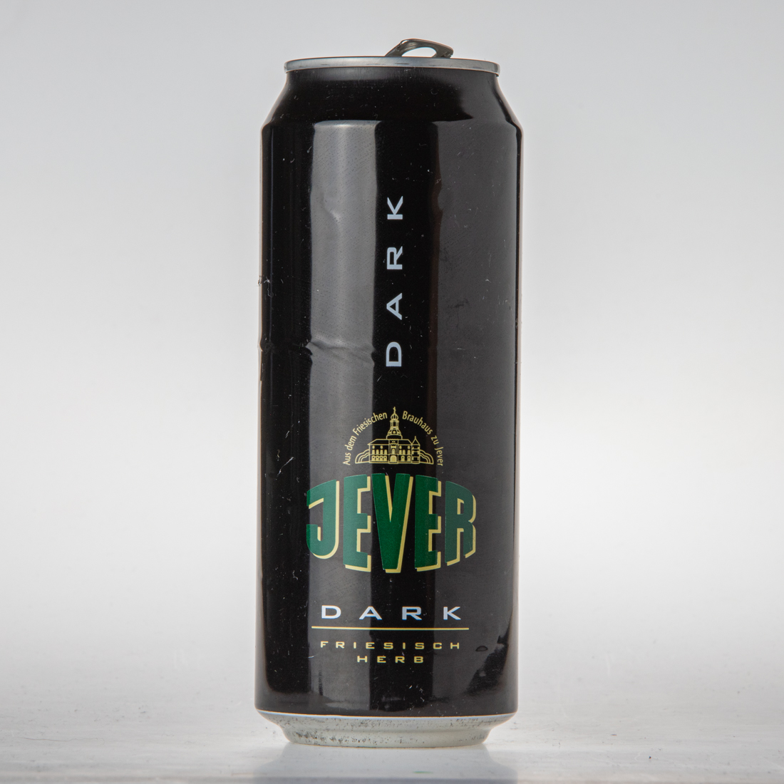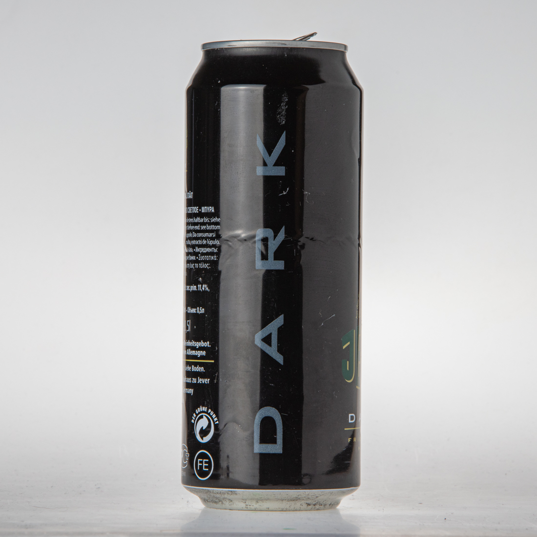Aus dem Friesischen Brauhaus zu Jever / JEVER / DARK / DUNKLE BIERSPEZIALITÄT / BIER BEER BIRRA CERVEZA … / Zutaten: Wasser, Gerstenmalz, Hopfenextrakt. Mindestens haltbar bis: siehe Boden. / Ingredients: water, malt, hops extract. Best before end: see bottom of can. / Ingredienti: acqua, malto, estratto di lupolo. Da consumarsi preferibilmente: vedi fondo. / Ingredientes: agua, malta, extracto de lupulo. Consumir prefrentemente antes des: ver base de la lata. / … / Cat. I, alc. 4,9%, Gradi.sacc. 11,9%, Ext.sec.prim. 11,4%, … / 17,6 fl.oz.imp. 0,5l 50cl 500ml … / alc. 4,9% vol e 0,5l / Gebraut nach dem Deutschen Reinheitsgebot. / Made in Germany Brassee en Allemagne / Mindestens haltbar bis Ende: siehe Boden. / Friesisches Brauhaus zu Jever 26441 Jever, Germany www.jever.de / Kühl lagern / DER GRÜNE PUNKT DOSEN RECYCLING FE
