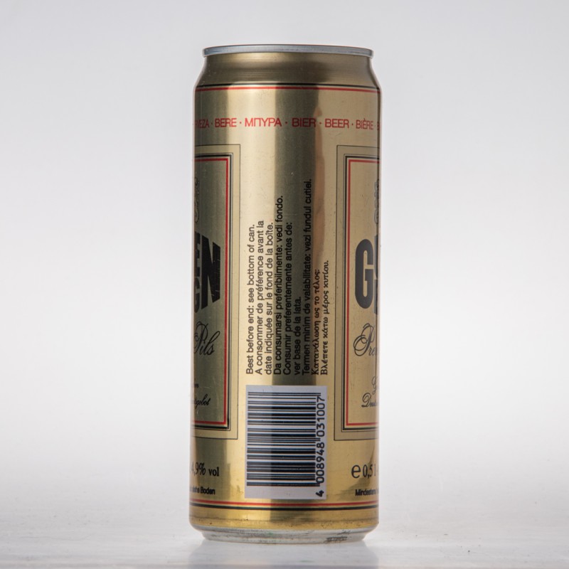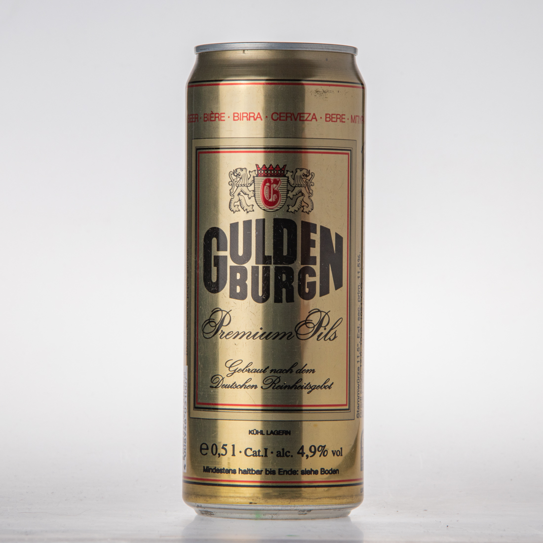 BEER BIERE BIRRA CERVEZA BERE / GULDENBURG Premium Pils / Gebraut nach dem Deutschen Reinheitsgebot / KÜHL LAGERN / e 0,5l Cat. I alc. 4,9% vol / Mindestens haltbar bis Ende: siehe Boden
