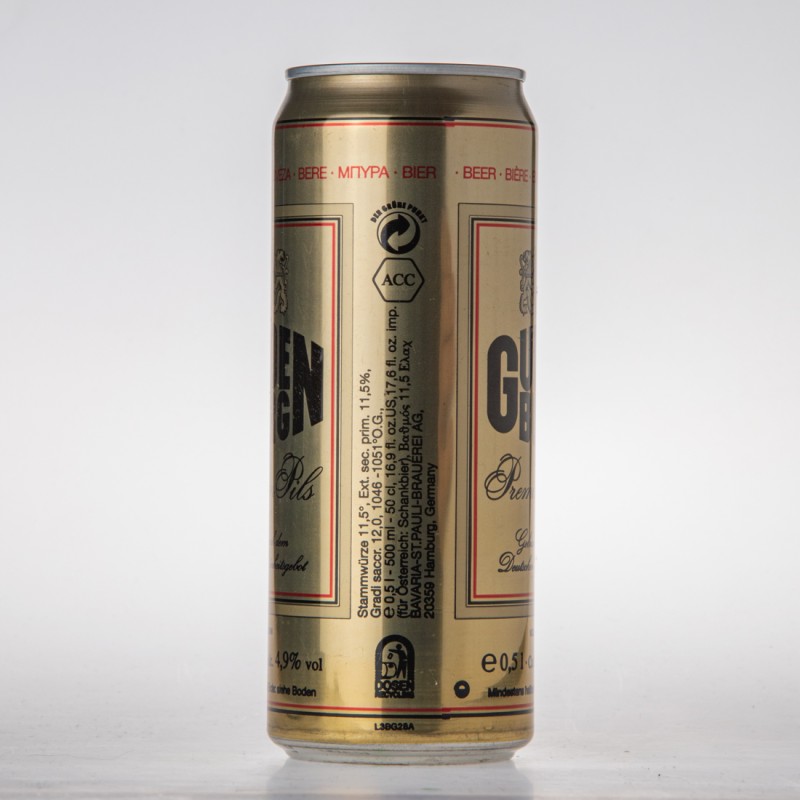 Best before end: see bottom of can. / A consommer de preference avant la date inliquee sur le fond de la boite / Da consumarsi preferentemente antes de: ver base de la lata / Termen minim de valabilitate: vezi fundul cutiel / … / 4 008949 031007 / DER GRÜNE PUNKT / ACC / Stammwürze 11,5°, Ext. sec. prim. 11,5%, Gradi saccr. 12,0, 1046-1051°O.G., e 0,5l - 500ml - 50cl, 16,9 fl. oz. US, 17,6 fl. oz. imp. (für Österreich: Schankbier), …, BAVARIA-ST. PAULI-BRAUEREI AG, 20359 Hamburg, Germany / DOSEN RECYCLING