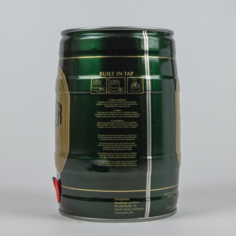 BIER BEER BIERE BIRRA CERVEZA CERVEJA PIWO JASNE PELNE SÖR STARKÖL ÖL / Für Austria: Vollbier Ingr.: Water, Barley Malt, Hop Extract, Hops / Skladniki: Woda, Slod Jeczmienny, Ekstrakt Chimielowy, Chmiel Zwa Ekstr. 11,2 / Zutaten: Wasser, Gerstenmalz, Hopfenextrakt, Hopfen Ingredients: Eau, Water, Barley Malt, Hop Extract, Hops, Ingredienti: Acqua, Malto D’Orzo, Extratto de Luppolo, Luppolo Ingredients: Agua, Malta de Cebada, Extracto de Lupulo, Lupulo / Mindestens haltbar bis Ende: siehe Dosendeckel / Best before end: see top of can / A consommer de preference aavant fin: voir la date en haut / Da consumarsi preferibilmente entro il: vedi data sopra / Consumir preferentemente antes del fin de: vease la fecha arriba / Ten minste houdbaar tot einde: zie Datum Bovenkant le Jarat Bäst före Utgängen av: Sie Burkens Överkant … / Kühl lagern bzw. vor dem Anstich kühlen - Serve cool Ideale Trinktemperatur liegt bei 8°-10° C / AUSTRALIA: Beach Avenue Wholesalers pty, Ltd., 47 Ind. Drive Braeside, vic 3195, Approx. 19 Standard drinks / CANADA: Quebec 20c consignee/refund / RUSSIA: … / e 5 Liter/Litres/Litri / alc. 4,9% vol./5% … 1,1 Imp. Gals / 5000ml 5x Cat. I 5lalc. 5% vol. / Cat. I, alc. 4,9% vol., Gradi sacc. 11,9% / Ext sec prim 11,4% / DER GRÜNE PUNKT / 4 008948 156014 / DOSEN RECYCLING / BUILT IN TAP / 1. Zapfen vorbereiten … / 2. Zapfen … / 3. Fass belüften … / Friesisches Brauhaus zu Jever Elisabethufer 18 26441 Jever, Germany www.jever.de