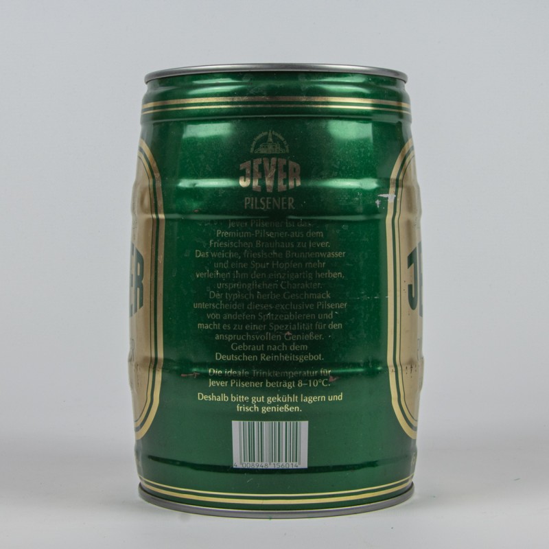 BIER BEER BIERE BIRRA CERVEZA CERVEJA PIWO JASNE PELNE SÖR STARKÖL ÖL / Für Austria: Vollbier Ingr.: Water, Barley Malt, Hop Extract, Hops / Skladniki: Woda, Slod Jeczmienny, Ekstrakt Chimielowy, Chmiel Zwa Ekstr. 11,2 / Zutaten: Wasser, Gerstenmalz, Hopfenextrakt, Hopfen Ingredients: Eau, Water, Barley Malt, Hop Extract, Hops, Ingredienti: Acqua, Malto D’Orzo, Extratto de Luppolo, Luppolo Ingredients: Agua, Malta de Cebada, Extracto de Lupulo, Lupulo / Mindestens haltbar bis Ende: siehe Dosendeckel / Best before end: see top of can / A consommer de preference aavant fin: voir la date en haut / Da consumarsi preferibilmente entro il: vedi data sopra / Consumir preferentemente antes del fin de: vease la fecha arriba / Ten minste houdbaar tot einde: zie Datum Bovenkant le Jarat Bäst före Utgängen av: Sie Burkens Överkant … / Kühl lagern bzw. vor dem Anstich kühlen - Serve cool Ideale Trinktemperatur liegt bei 8°-10° C / AUSTRALIA: Beach Avenue Wholesalers pty, Ltd., 47 Ind. Drive Braeside, vic 3195, Approx. 19 Standard drinks / CANADA: Quebec 20c consignee/refund / RUSSIA: … / e 5 Liter/Litres/Litri / alc. 4,9% vol./5% … 1,1 Imp. Gals / 5000ml 5x Cat. I 5lalc. 5% vol. / Cat. I, alc. 4,9% vol., Gradi sacc. 11,9% / Ext sec prim 11,4% / DER GRÜNE PUNKT / 4 008948 156014 / DOSEN RECYCLING / BUILT IN TAP / 1. Zapfen vorbereiten … / 2. Zapfen … / 3. Fass belüften … / Friesisches Brauhaus zu Jever Elisabethufer 18 26441 Jever, Germany www.jever.de