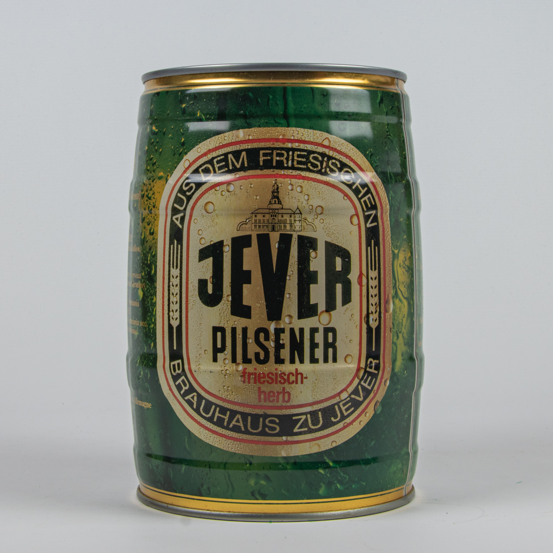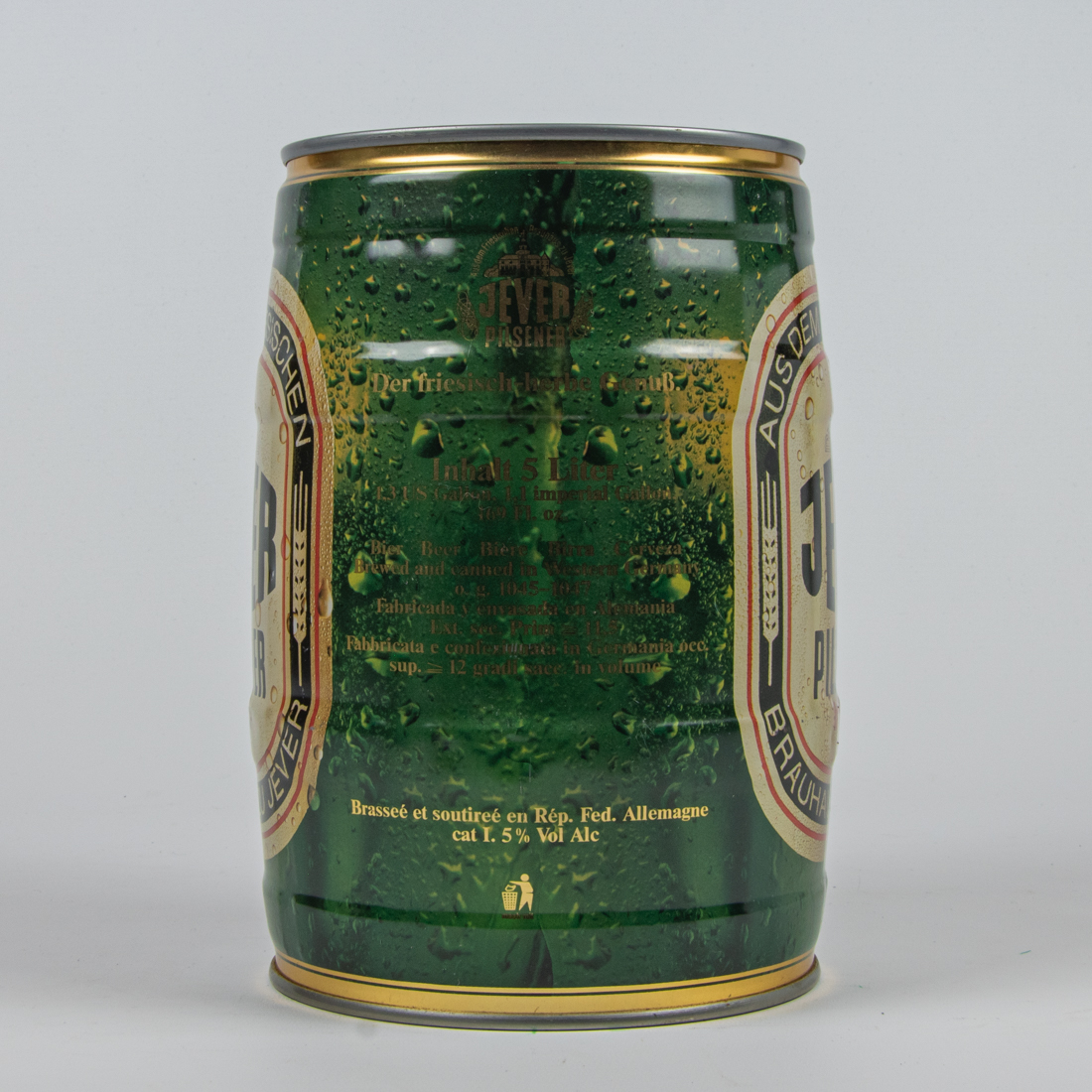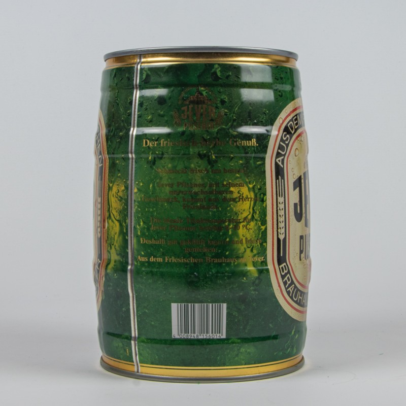 Aus dem Friesischen Brauhaus zu Jever / JEVER / PILSENER / Der friesisch-herbe Genuß. / Schmeckt frisch am besten! / Jever Pilsener, mit seinem unverwechselbaren Geschmack, kommt aus dem Herzen Frieslands. / Die ideale Trinktemperatur für Jever Pilsener beträgt 8-10° C. / Deshalb gut gekühlt lagern und frisch genießen. / Aus dem Friesischen Brauhaus zu Jever. / 4 008948 156014 / Aus dem Friesischen Brauhaus zu Jever / JEVER / PILSENER / Der friesisch-herbe Genuß. / Inhalt 5 Liter / 1,3 US Gallon, 1,1 imperial Gallon. 169 Fl. oz. / Bier Beer Biere Birra Cerveza / Brewed and canned in Western Germany / o.g. 1045-1047 / Fabricada y envasada en Alemania / Ext. sec. Prim. 11,5 / Fabbricata e confezionata in Germania occ. sup. 12 gradi sacc. in volume / Brassee et soutiree en Rep. Fed. Allemagne cat I 5% Vol. Alc / mach mit