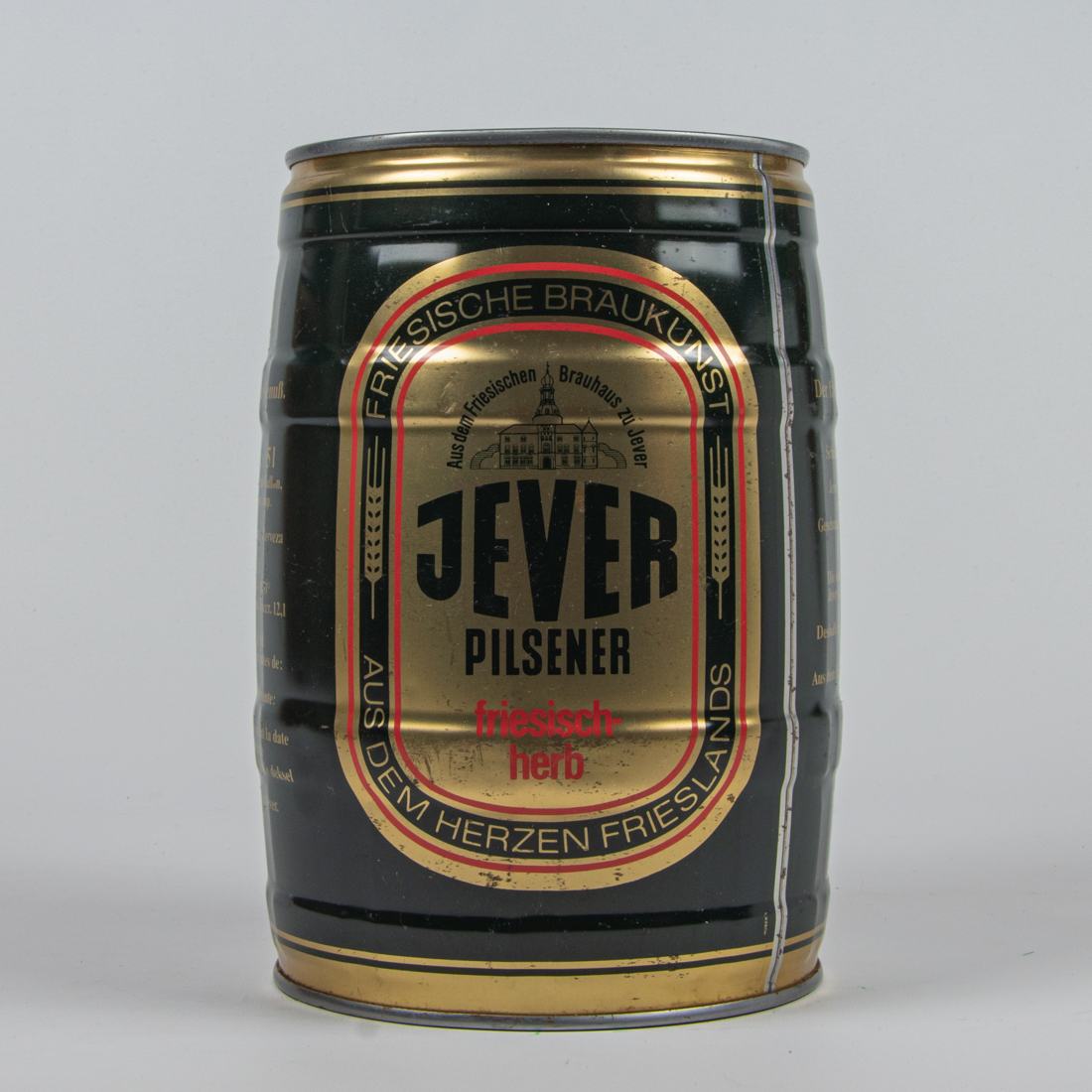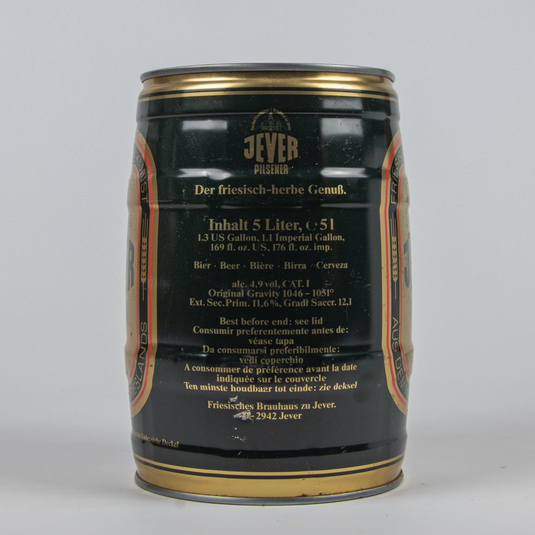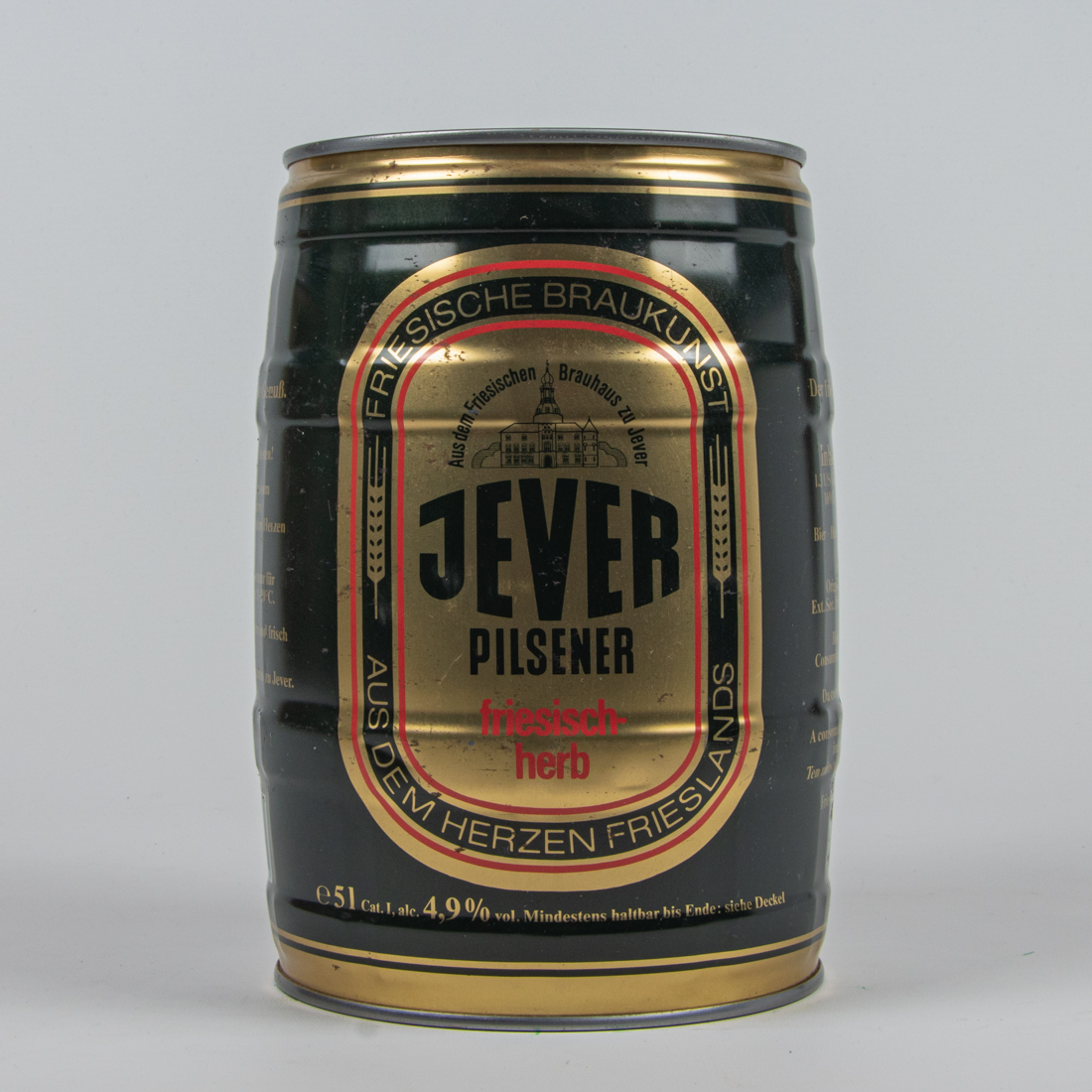 Aus dem Friesischen Brauhaus zu Jever / JEVER / PILSENER / Der friesisch-herbe Genuß. / Schmeckt frisch am besten! / Jever Pilsener, mit seinem unverwechselbaren Geschmack, kommt aus dem Herzen Frieslands. / Die ideale Trinktemperatur für Jever Pilsener beträgt 8-10° C. / Deshalb gut gekühlt lagern und frisch genießen. / Aus dem Friesischen Brauhaus zu Jever. / DOSEN RECYCLING / 4 008948 156014 / Aus dem Friesischen Brauhaus zu Jever / JEVER / PILSENER / Der friesisch-herbe Genuß. / Inhalt 5 Liter / 1,3 US Gallon, 1,1 imperial Gallon. 169 Fl. oz. US 176 fl. oz. imp. / Bier Beer Biere Birra Cerveza / alc. 4,9 vol CAT. I Original Gravity 1046-1051° Ext. sec. Prim. 11,6% Gradi Saccr. 12,1 / Best before end: see lid Consumir preferentemente antes de: vease tapa Da consumarsi preferibilmente: vedi coperchio A consommer de preference avant la date indiquee sur le couvercle Ten minste houdbaar ot einde: zie deksel / Friesisches Brauhaus zu Jever. D-2942 Jever