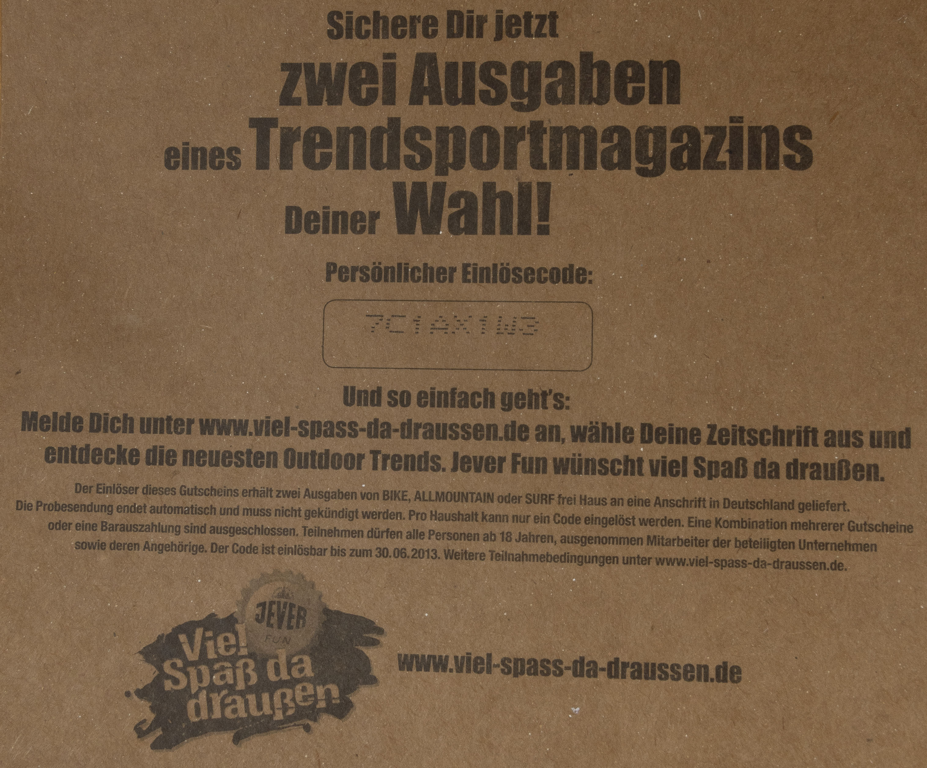 Sichere Dir jetzt zwei Ausgaben eines Trendsportmagazins Deiner Wahl! / Persönlicher Einlösecode: 7C1AX1W3 / Und so einfach geht’s: Melde Dich unter www.viel-spaxx-da-draussen.de an, wähle Deine Zeitschrift aus und entdecke die neuesten Outdoor-Trends. Jever Fun wünscht viel Spaß da draußen. / Der Einlöser dieses Gutscheins erhält zwei Ausgaben von BIKE, ALLMOUNTAIN oder SURF frei Haus an eine Anschrift in Deutschland geliefert. Die Probesendung endet automatisch und muss nicht gekündigt werden. Pro Haushalt kann nur ein Code eingelöst werden. Eine Kombination mehrerer Gutscheine oder eine Baruaszahlung sind ausgeschlossen. Teilnehmen dürfen alle Personen ab 18 Jahren, ausgenommen Mitarbeiter der beteiligten Unternehmen. sowie derem Angehörige. Der Code ist einlösbar bis zum 30.06.2013. Weitere Teilnahmebedingungen unter www.viel-spass-da-draussen.de. / Friesisches Brauhaus / JEVER / FUN / Viel Spaß da draußen / www.viel-spass-da-draussen.de